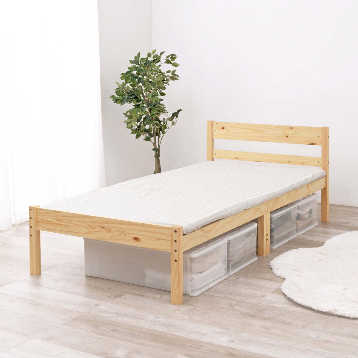 ナチュラルな風合いがお部屋に映えるベッドフレームです。床面は通気性の良いすのこで、汗や湿気を溜め込まず、年中快適におやすみいただけます。天然木の温もりが感じられる柔らかなパイン材を使用しているので、美しい木目と経年による色の変化を楽しめます。