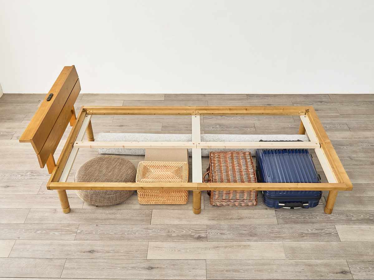 ベッド下は収納スペースとしてお使いいただけます。収納ケースの他、キャリーバッグやラグ、布団や季節用品など、かさばるものや使用頻度の低い物の収納にもぴったりです。