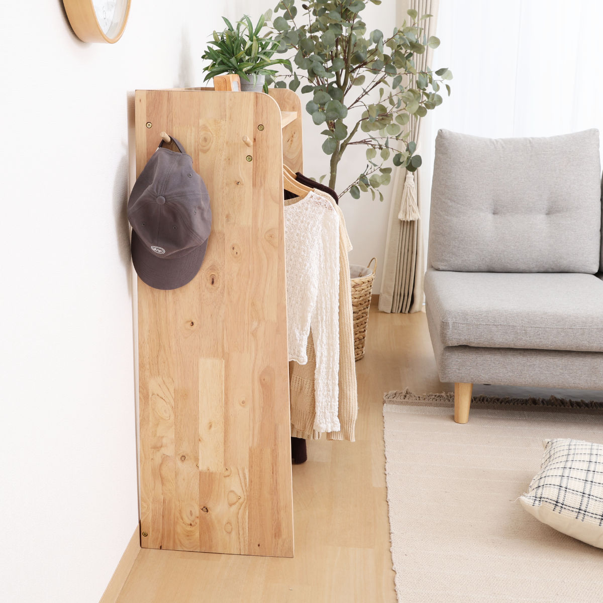 天然木の木目や節といった個性をそのまま活かしたデザインのハンガーラックです。掛け幅66cmでたっぷりと掛けられ、サッと取り出すことができます。高さは100cmと、お子様でも使いやすい高さでお部屋を圧迫しません。