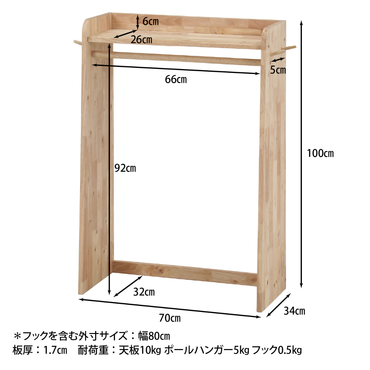 | サイズ | 約 幅70×奥行34×高さ100(cm) ※サイドフック含む幅:約 80cm |