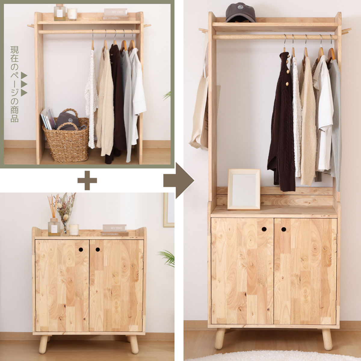 別売りのボトムラックと組み合わせれば、さらに収納を増やせます。ボトムラックも、用途やお部屋の雰囲気に合わせて、扉付きキャビネットかオープンラックかをお選びいただけます。