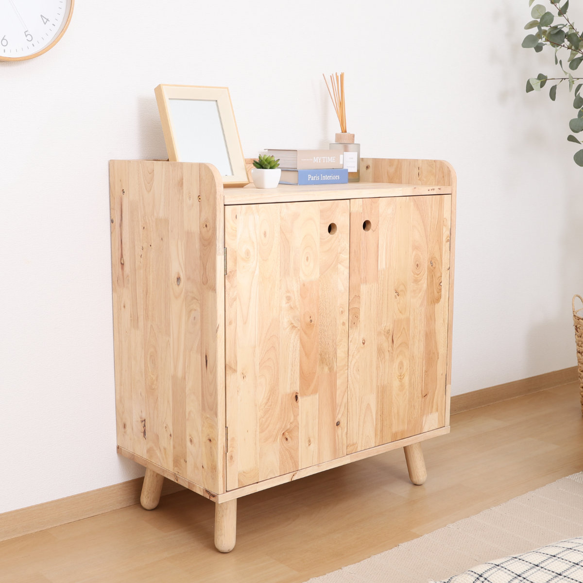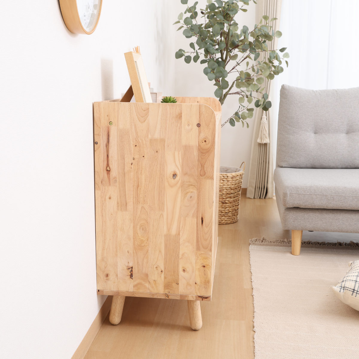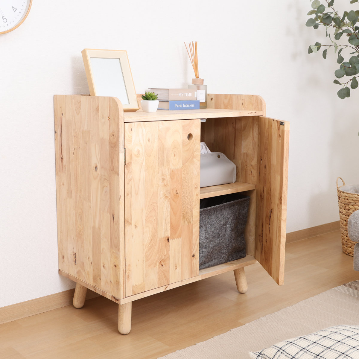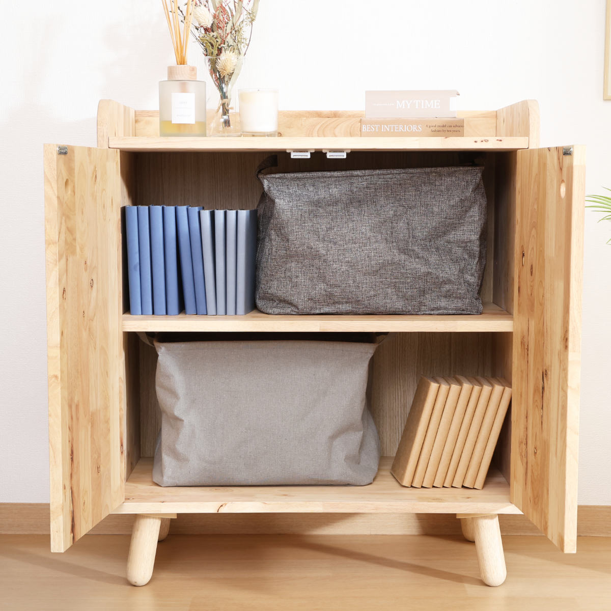 天然木の木目や節といった個性をそのまま活かしたデザインの扉付きキャビネットです。見せたくないものを、スッキリとした扉で隠して収納ができます。高さは80cmと、お子様でも使いやすい高さでお部屋を圧迫しません。