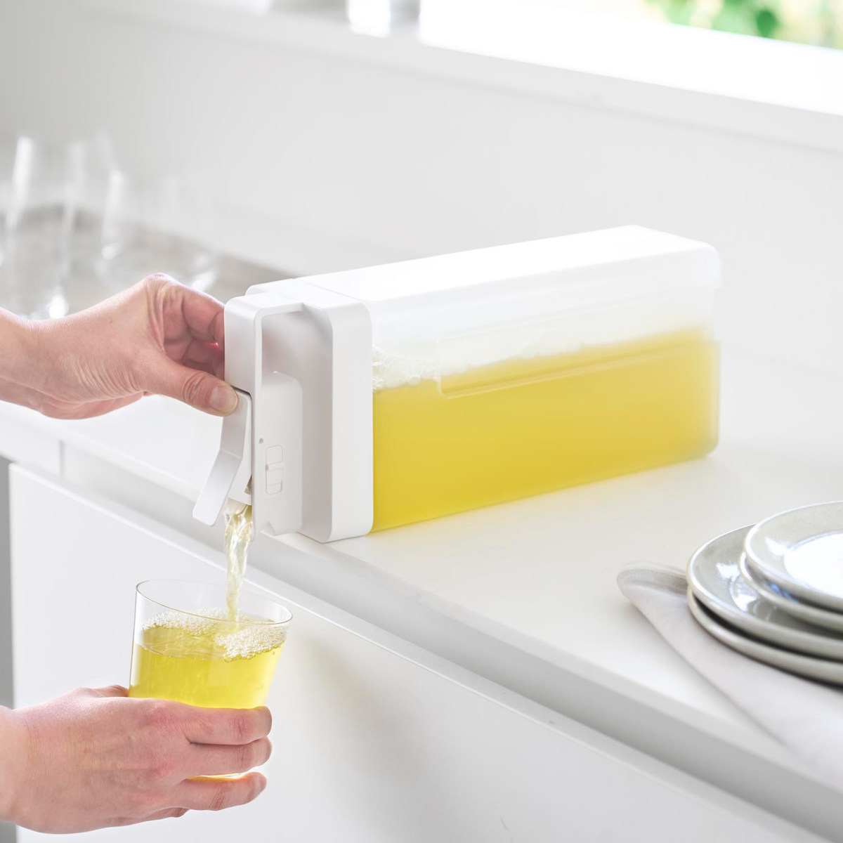 冷蔵庫の棚に倒して置ける冷水筒です。冷蔵庫から出さずに直接コップにドリンクを注げて便利です。飲みたい時にサッと水分補給ができます。