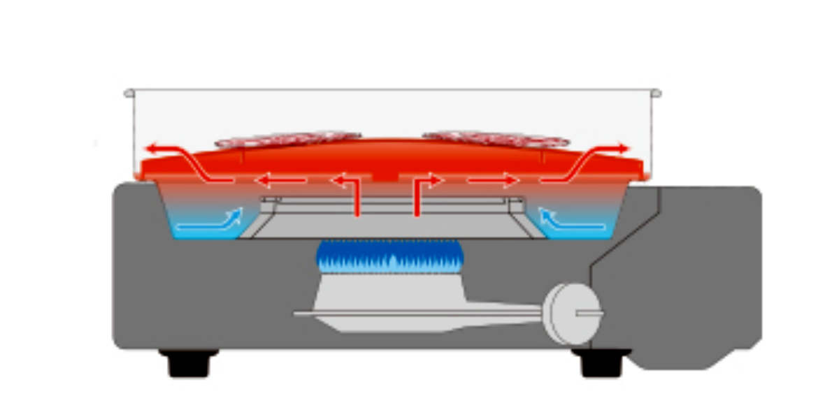 バーナーとプレートの間に適度に熱がこもる構造でプレート表面を約210~250度にコントロール。プレートの高温化を防ぐことで、脂の煙化を防ぎ、煙も抑えます。
