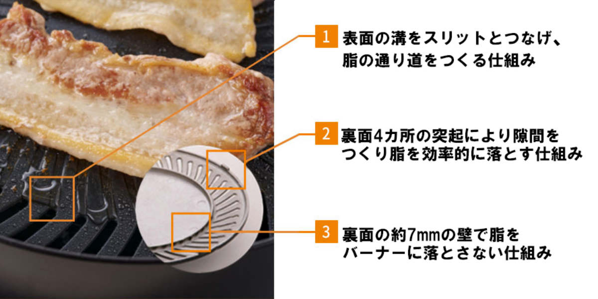 ●脂を炎に落ちにくく、プレートの高温化も防ぐので煙が出にくい構造です。