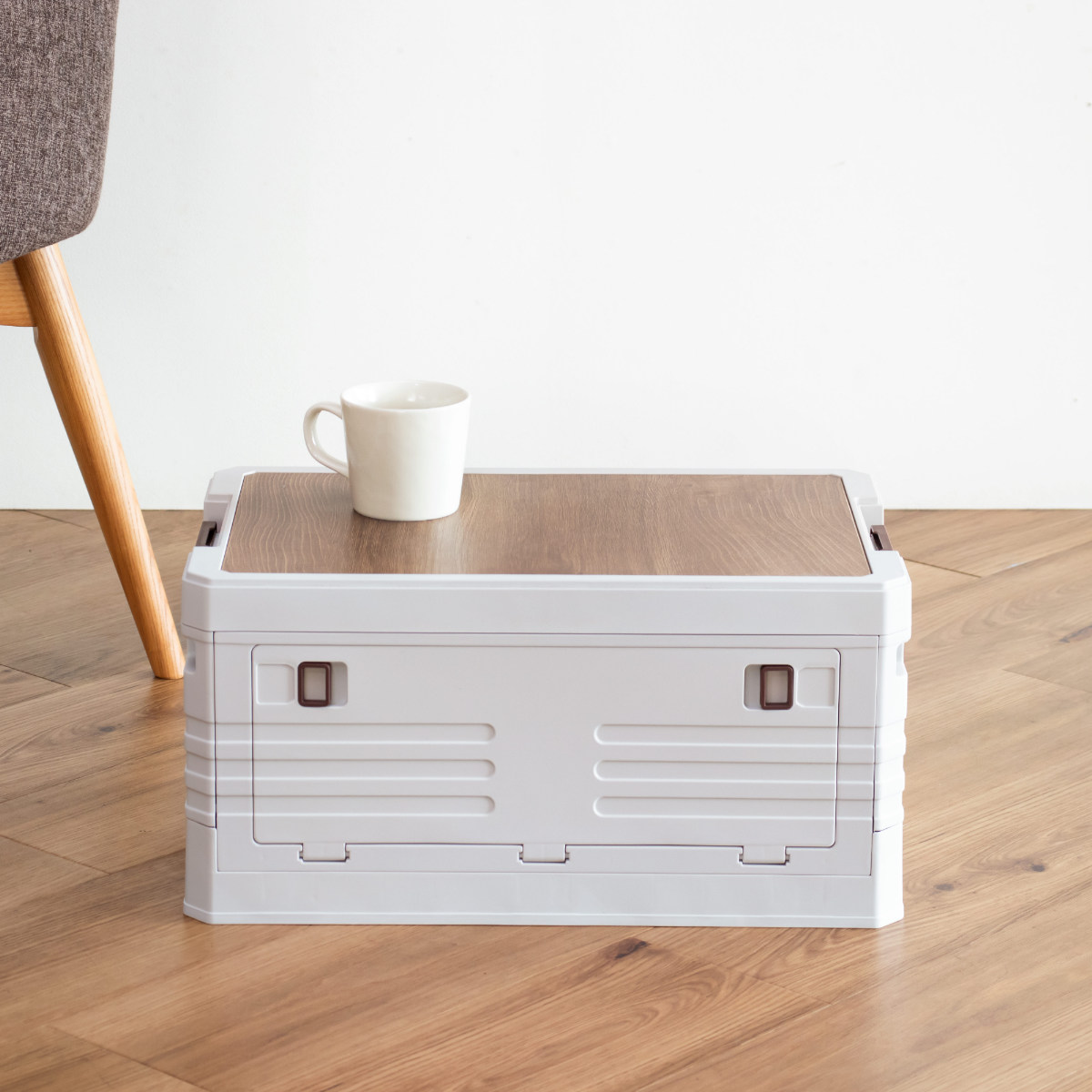 蓋には温かみを感じられる木目調の天板が付いています。アウトドアやレジャーシーンではテーブルとしてもお使いいただけます。また、天板は取り外しが可能です。