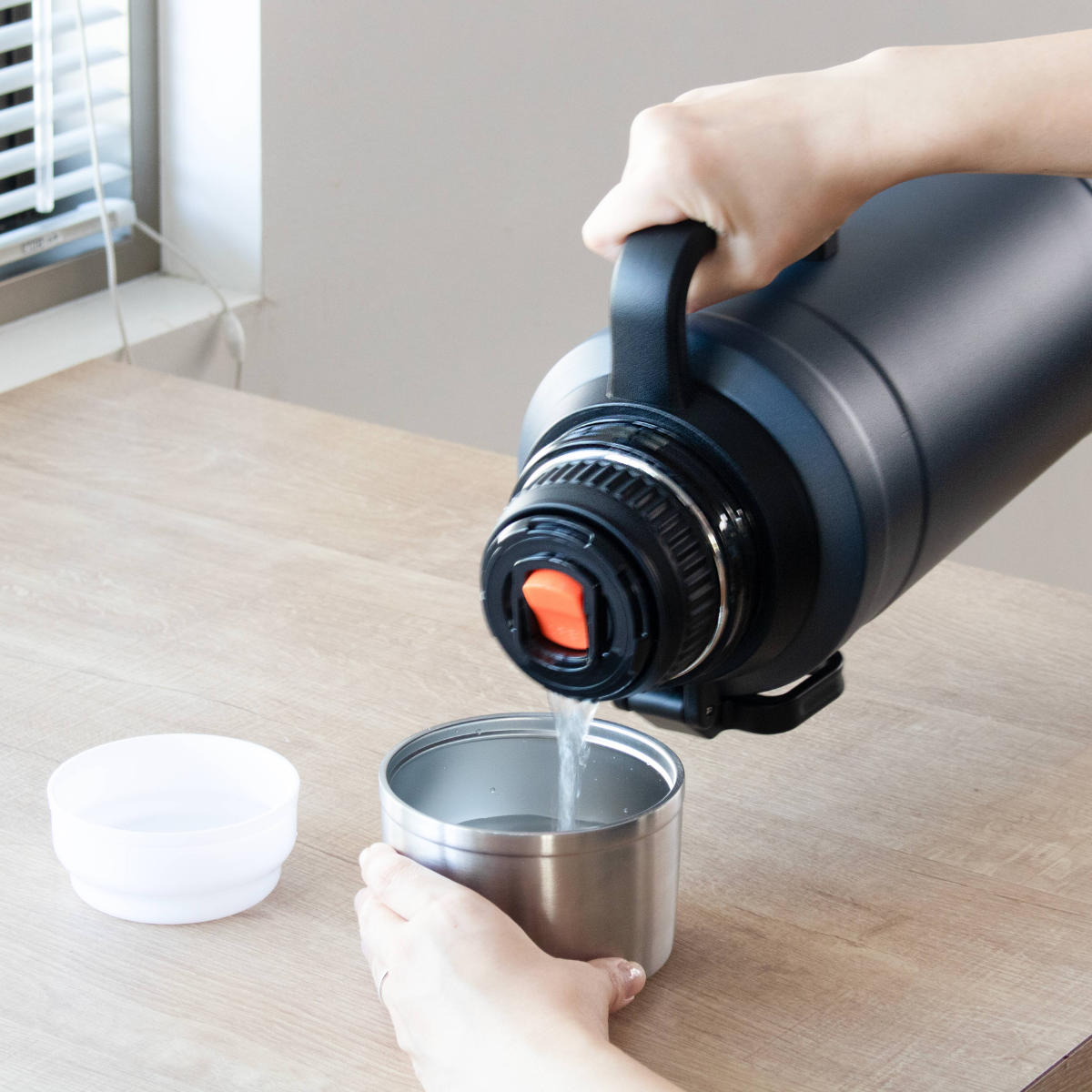 | 材質 | 内びん:ステンレス鋼 胴部:ステンレス鋼(ポリエステル粉体塗装) 外コップ・弁外側:ステンレス鋼 内コップ・中せん:ポリプロピレン 開閉スイッチ:ABS樹脂 注ぎ用ハンドル・持ち手:ポリプロピレン パッキン・すべり止め:シリコーンゴム |