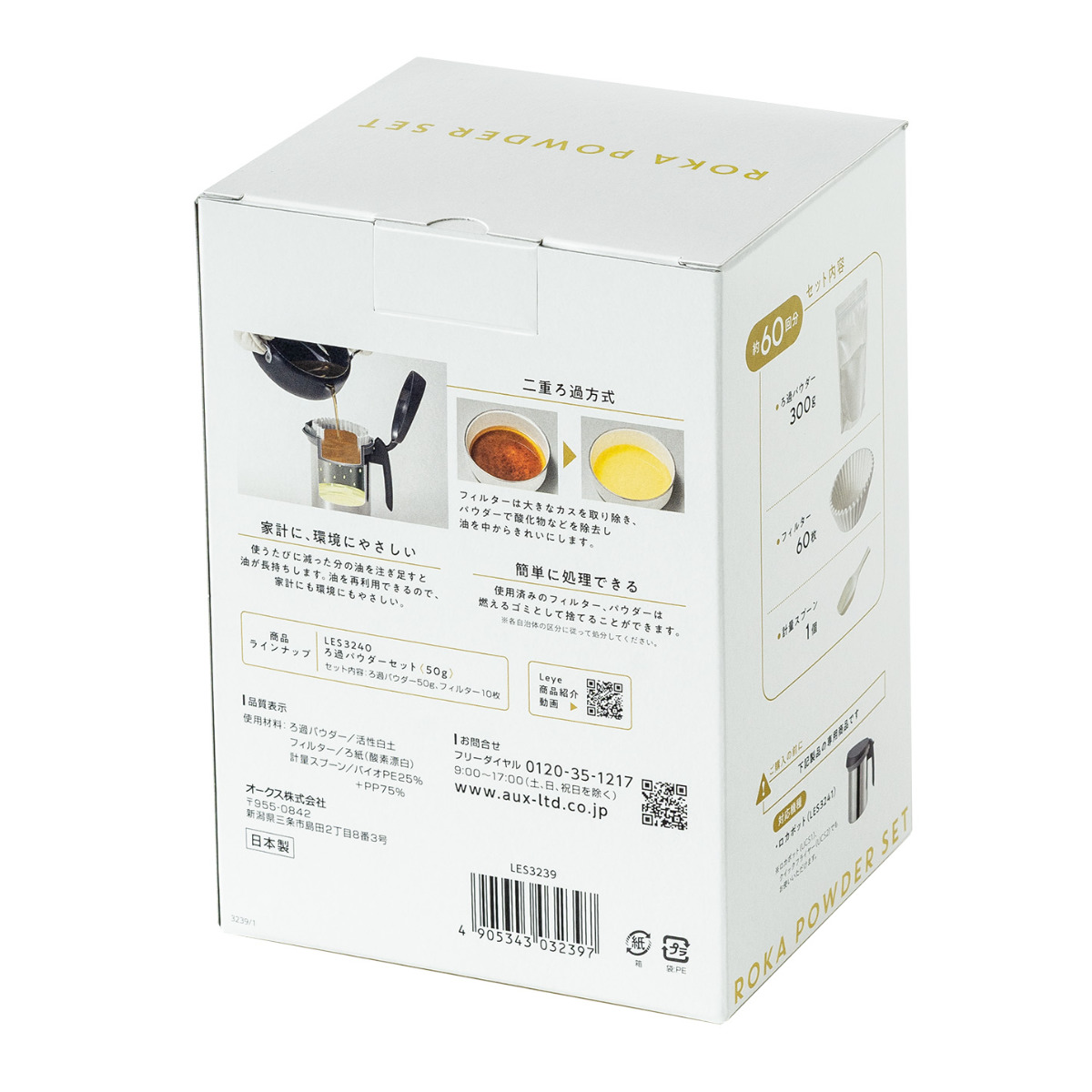 | 材質 | ろ過パウダー:活性白土 フィルター:ろ紙 計量スプーン:バイオPE+PP |