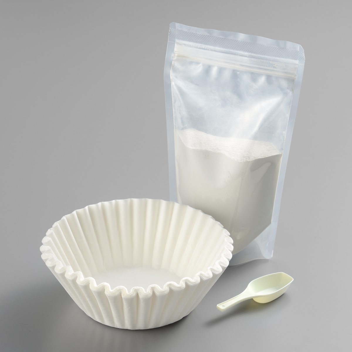 ろ過パウダー300g(約60回分)、フィルター60枚、計量スプーンのセットです。ろ過パウダーとフィルターは使用ごとに交換してください。