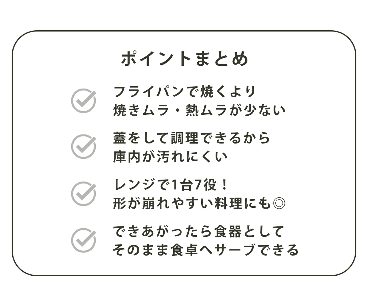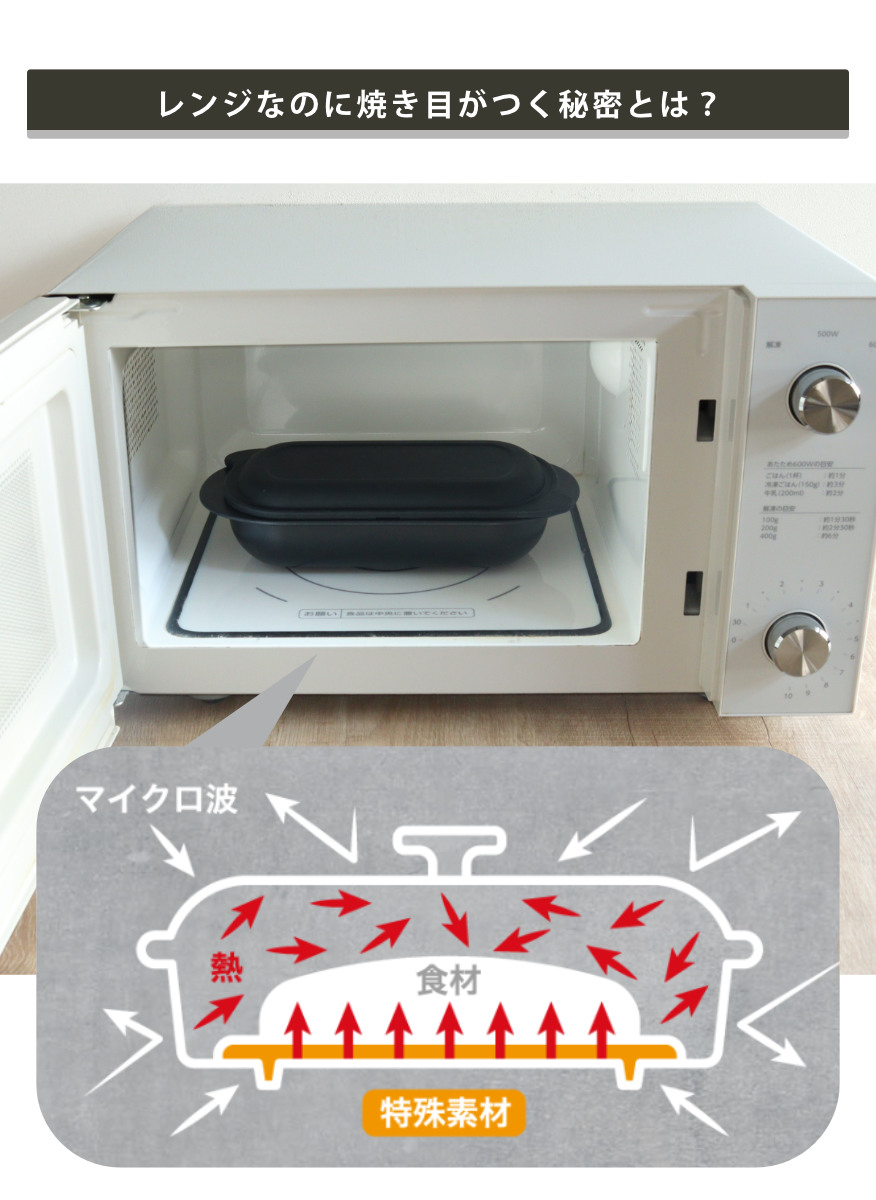 電子レンジのマイクロ波を直接食材に当てず、底面の特殊素材に当てる事で本体底面を発熱させ、まるでフライパンで焼いたような焼き目をつけることができます。