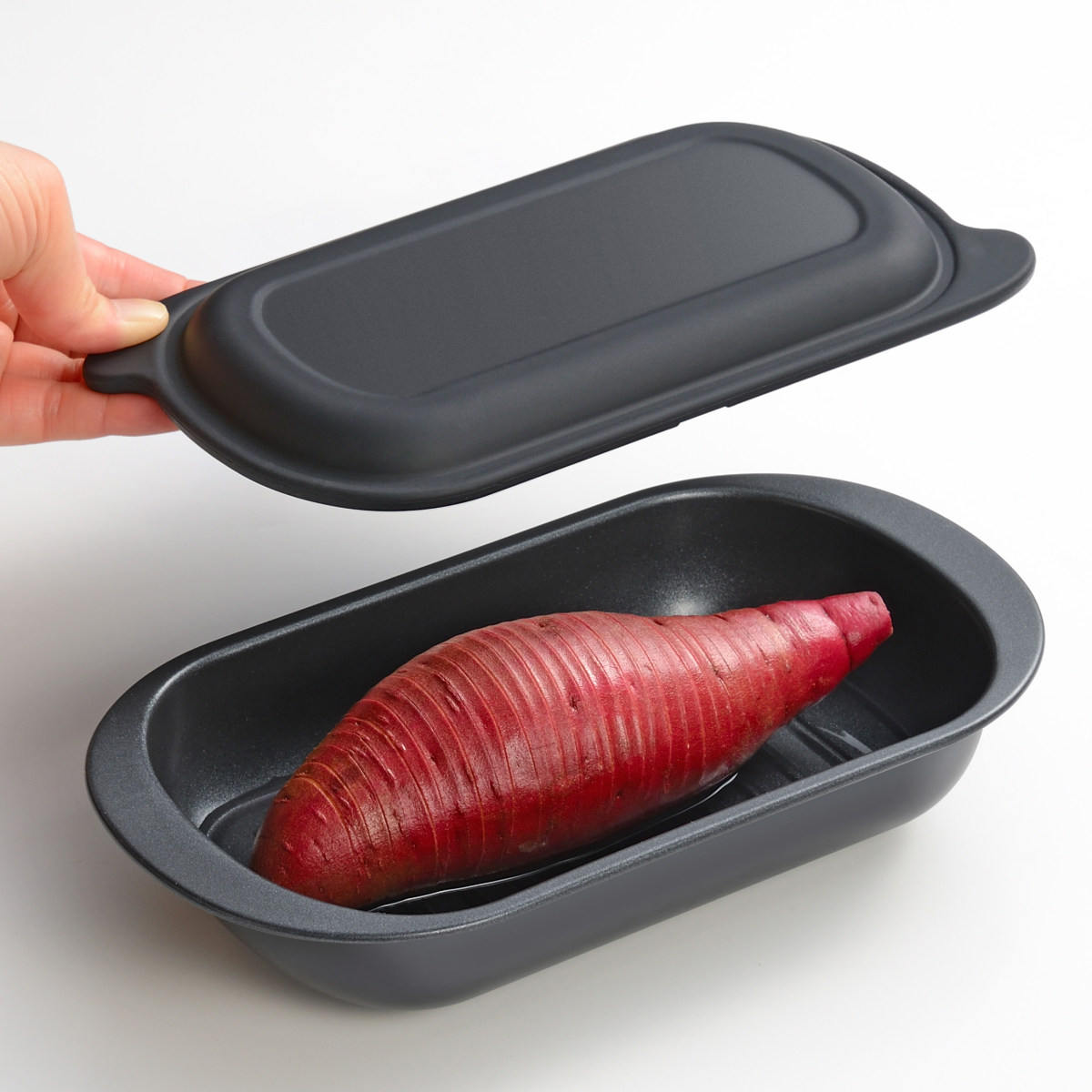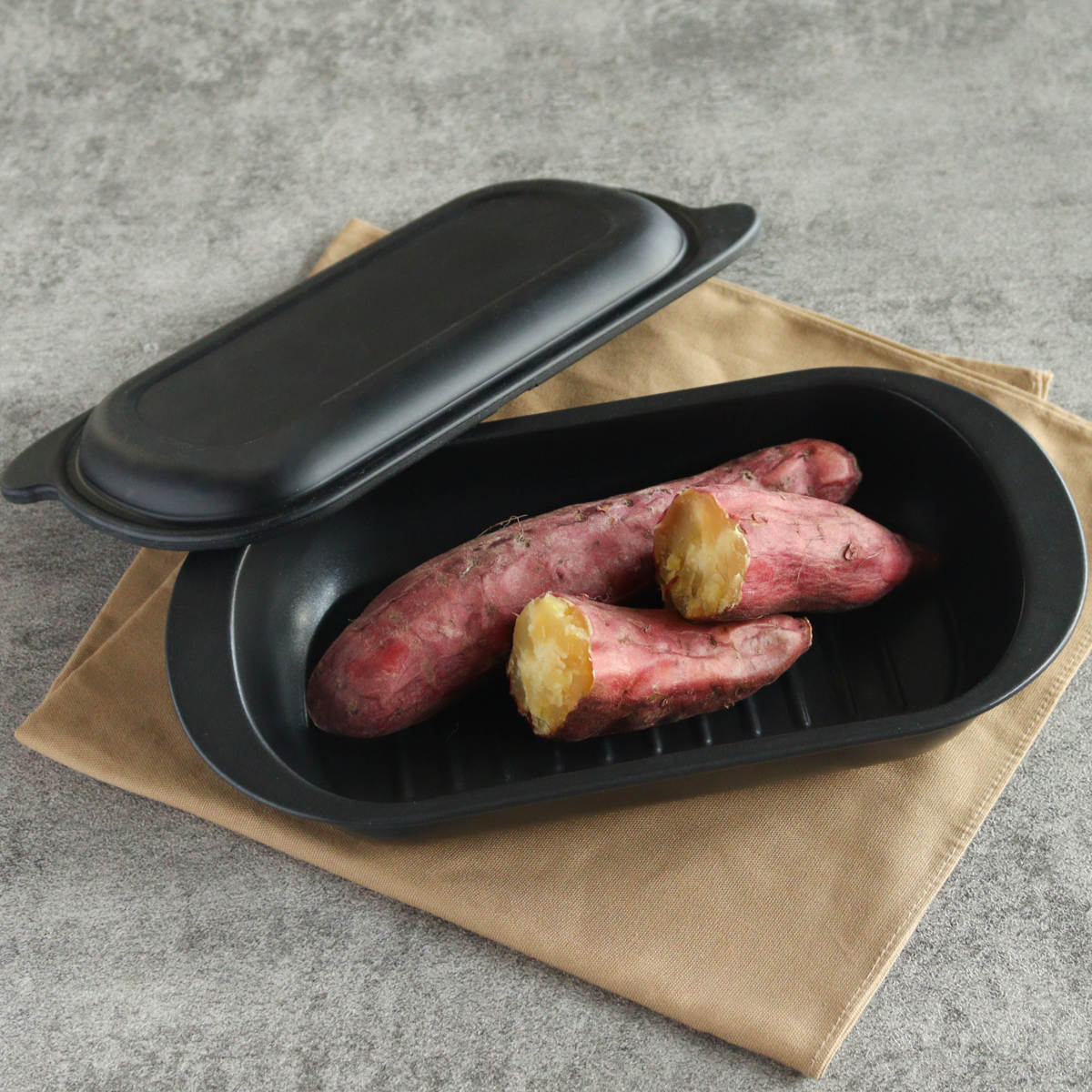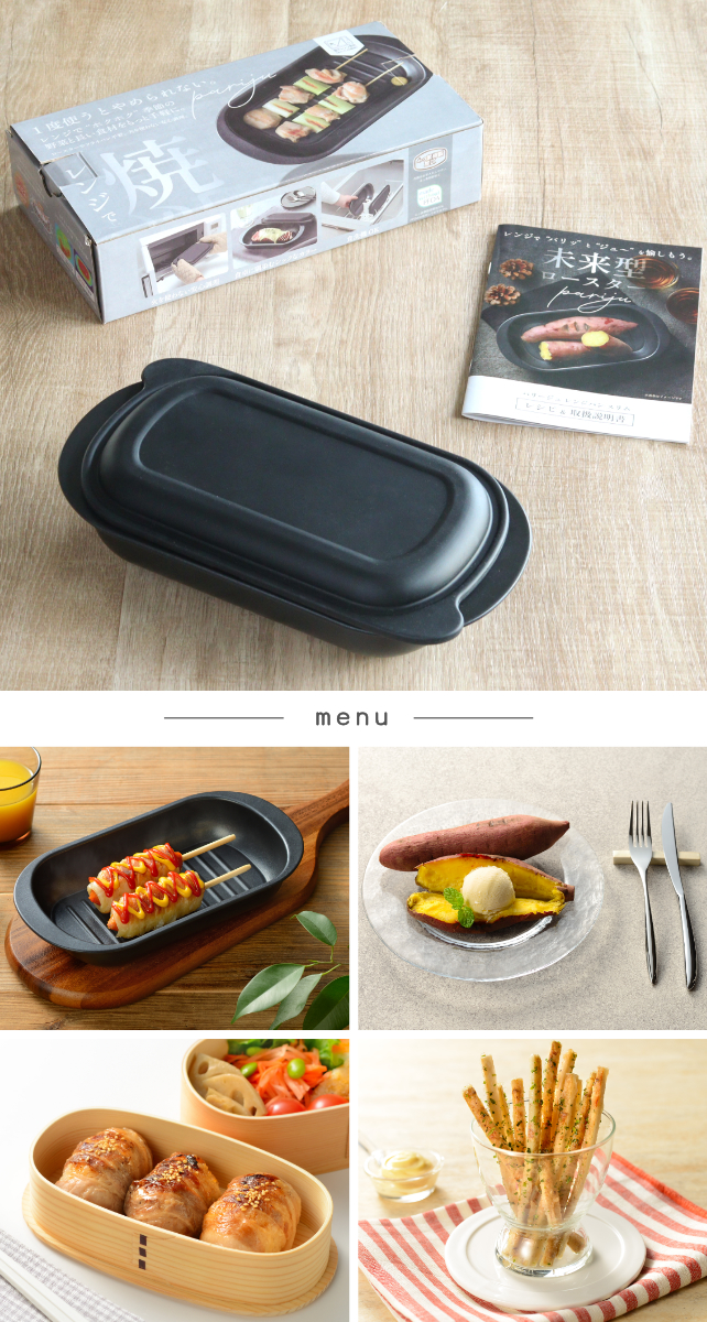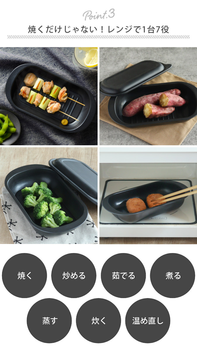 「焼く」以外にも「茹でる」「蒸す」「炊く」など、あらゆる調理が可能です。電子レンジだと火加減を気にせず、ほったらかしておくだけでできあがるのが嬉しいポイント。角型は長い食材にも使いやすく、焼き鳥やも焼き芋も上手に焼き上げられます。