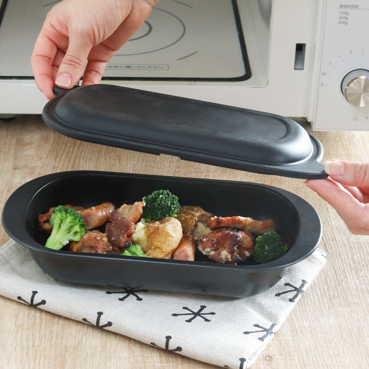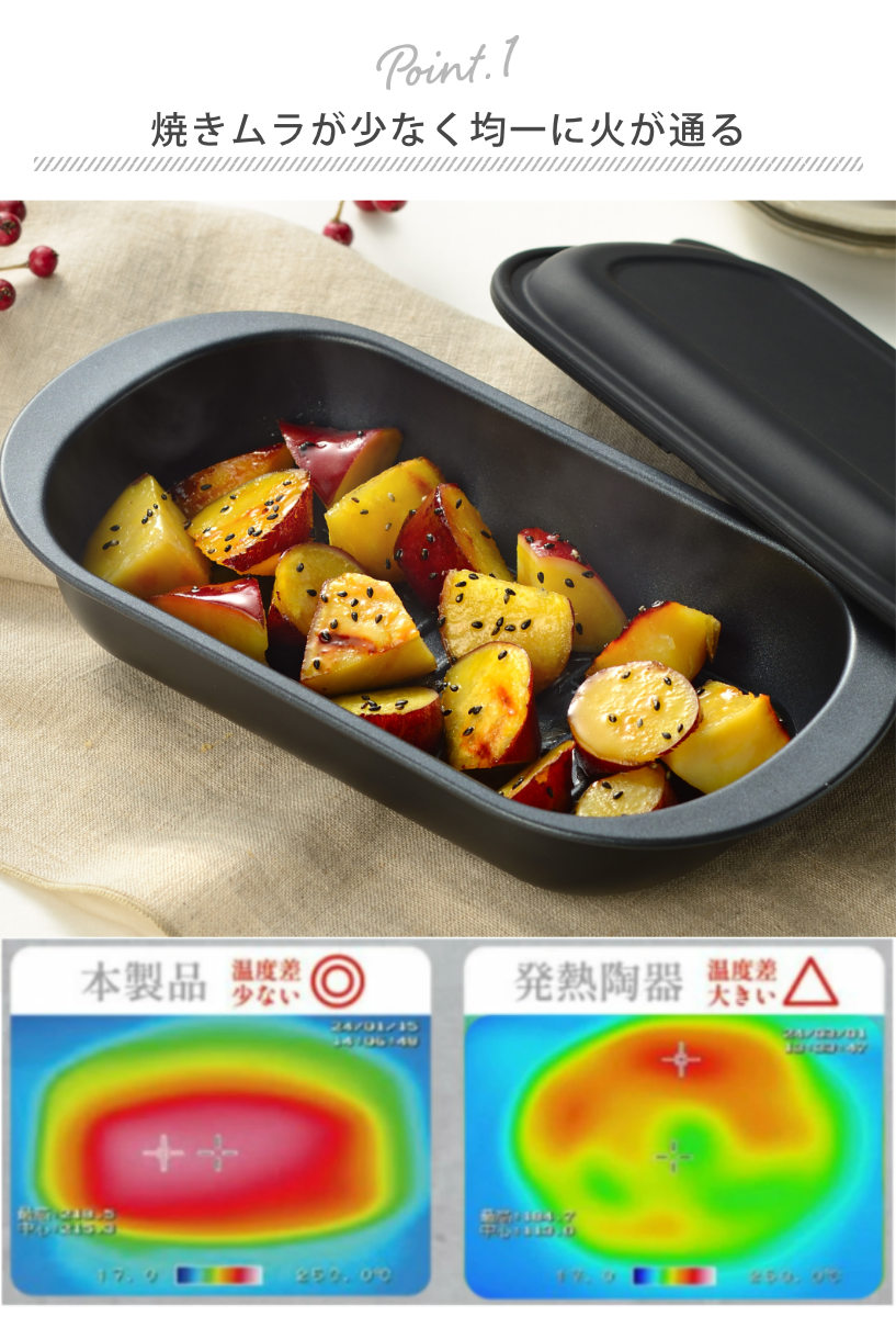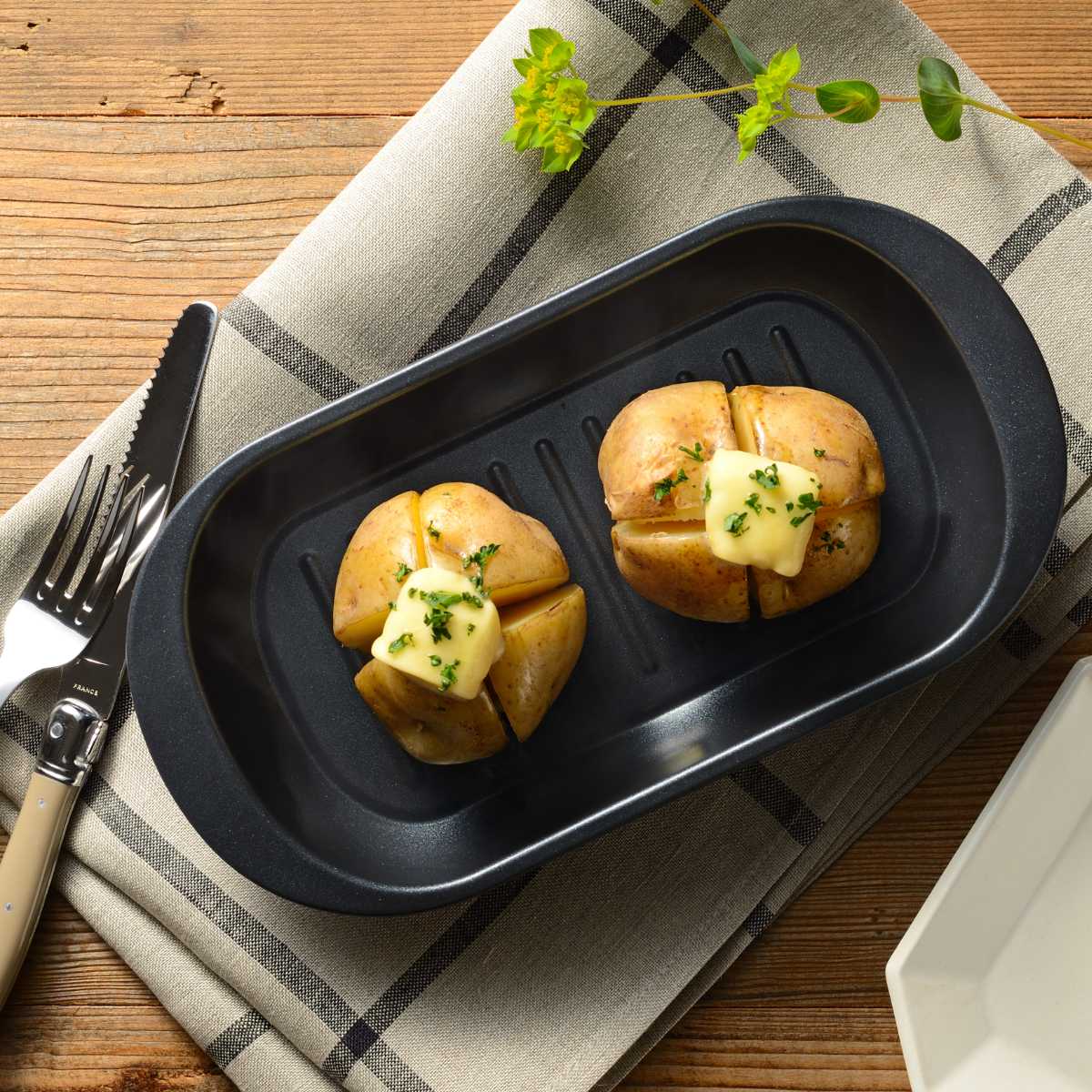 「焼く」以外にも「茹でる」「蒸す」「炊く」など、あらゆる調理が可能です。電子レンジだと火加減を気にせず、ほったらかしておくだけでできあがるのが嬉しいポイント。角型は長い食材にも使いやすく、焼き鳥やも焼き芋も上手に焼き上げられます。