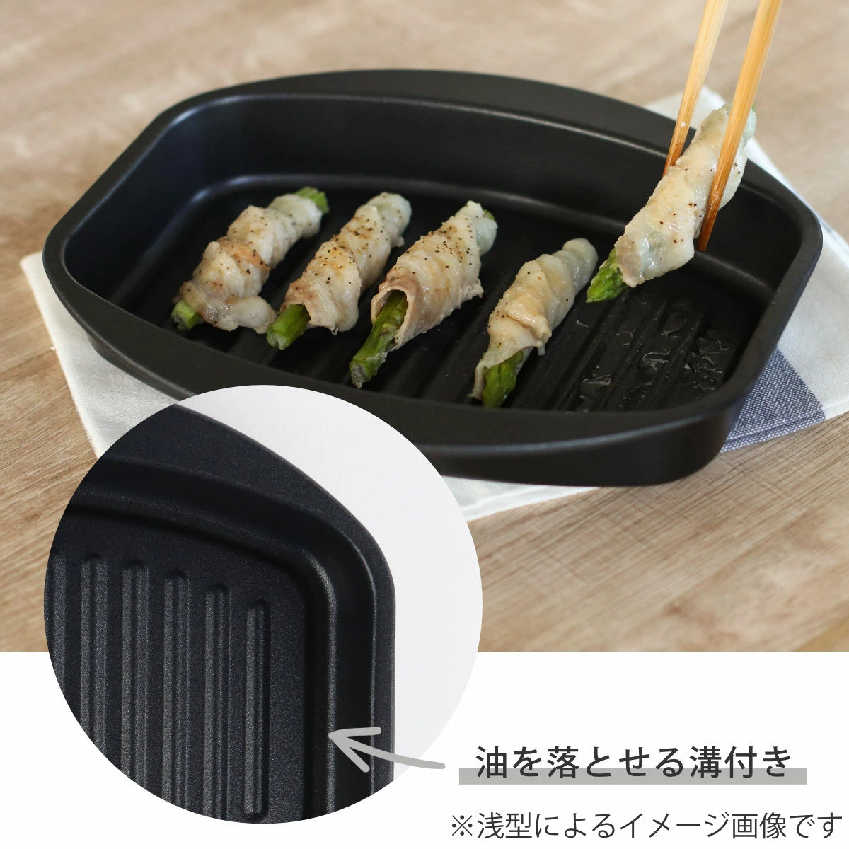 フチに付いている溝に食材から出た油が落ち、ヘルシーに調理できます。