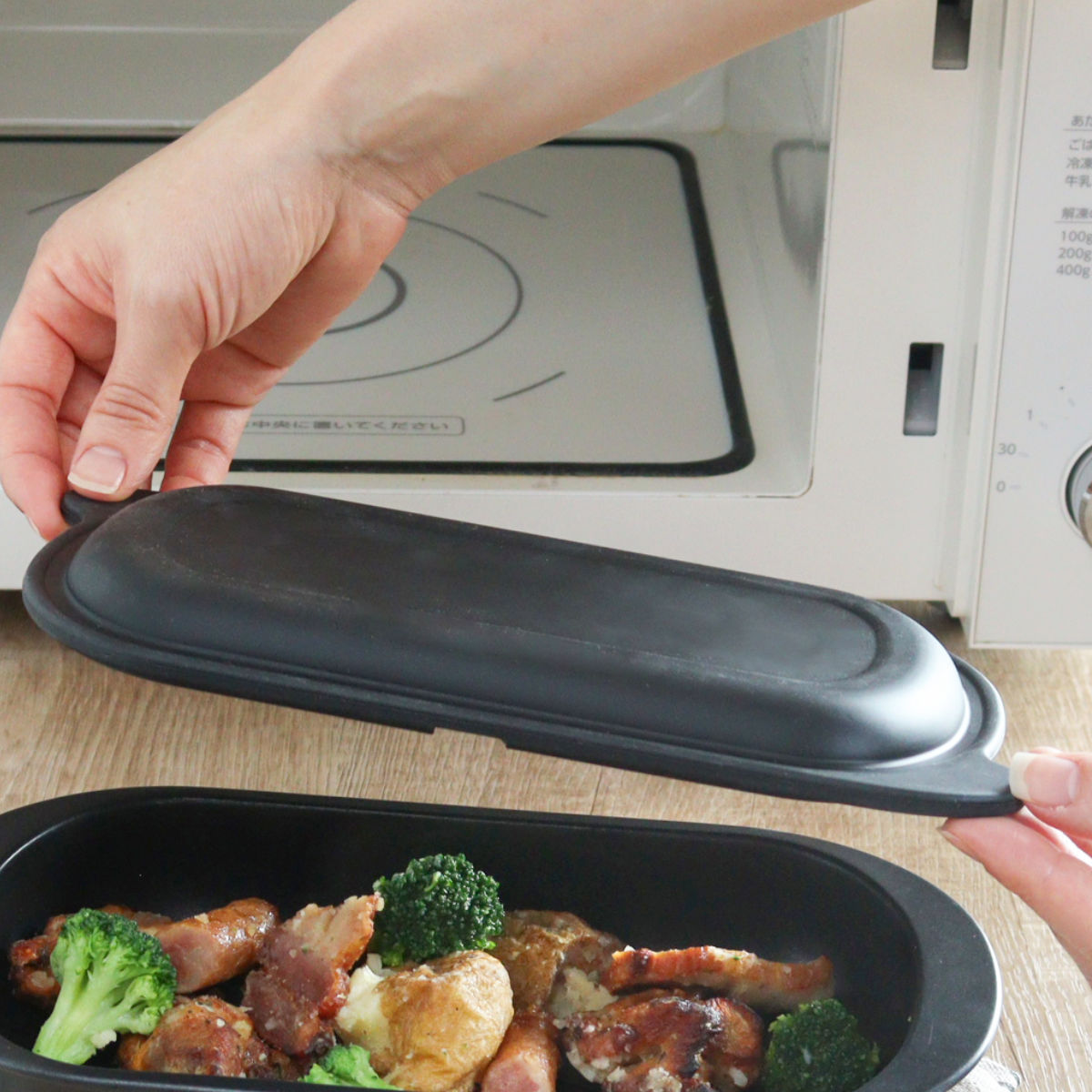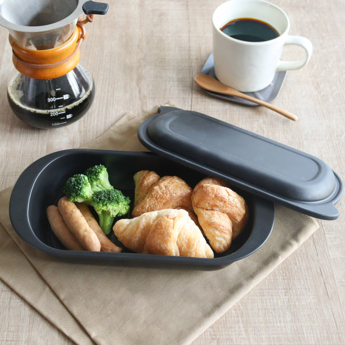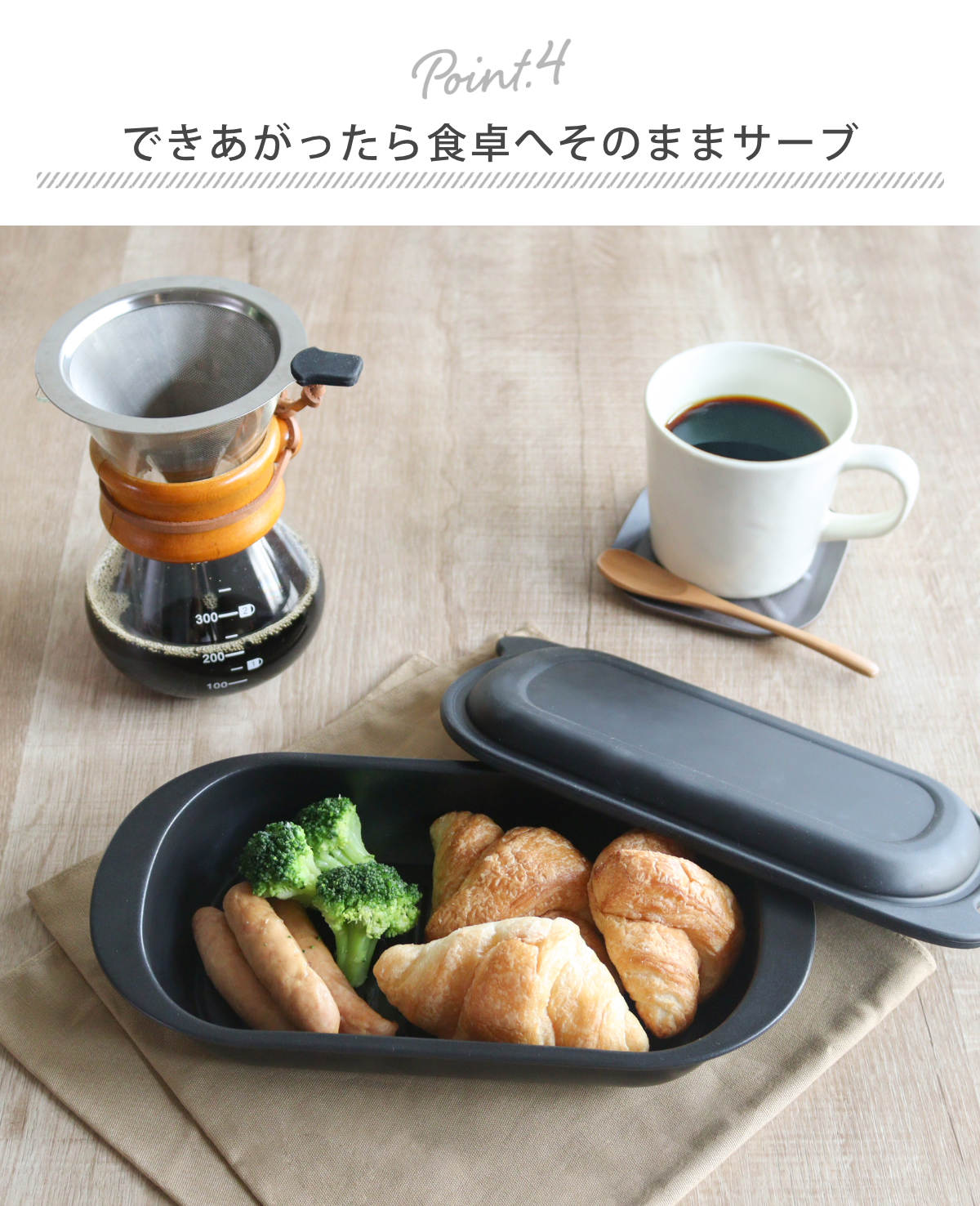 食卓でも様になるおしゃれなデザインも魅力です。調理から食事までこれひとつで済ませられ、洗い物も最小限に。忙しい朝にもおすすめで、全部まとめてレンジでチンすれば、パパッと朝食プレートが完成します。