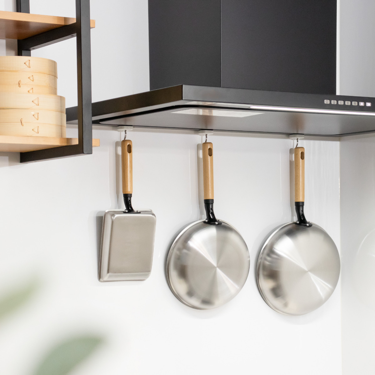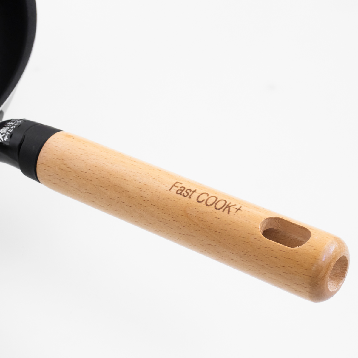持ち手には手になじみやすく、加熱中でも熱くなりにくい天然木を使用しています。スタイリッシュでありながら、ナチュラルな雰囲気のキッチンにも馴染むデザインです。