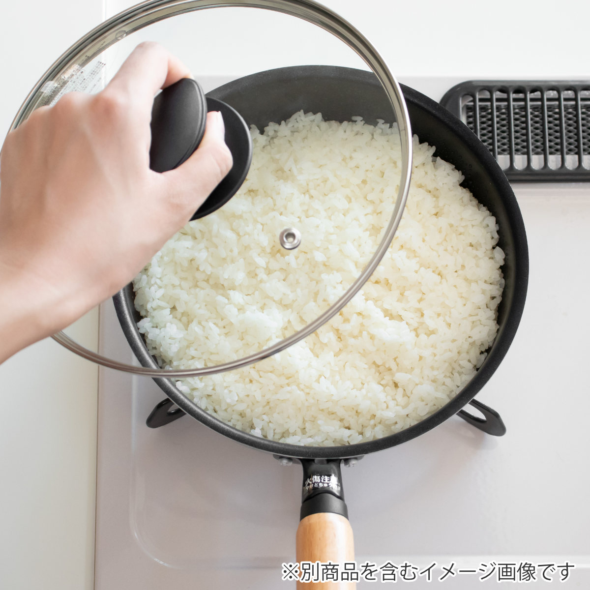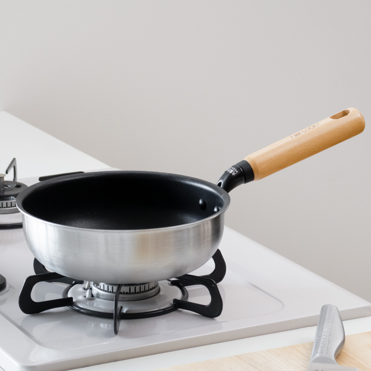 持ち手には手になじみやすく、加熱中でも熱くなりにくい天然木を使用しています。スタイリッシュでありながら、ナチュラルな雰囲気のキッチンにも馴染むデザインです。