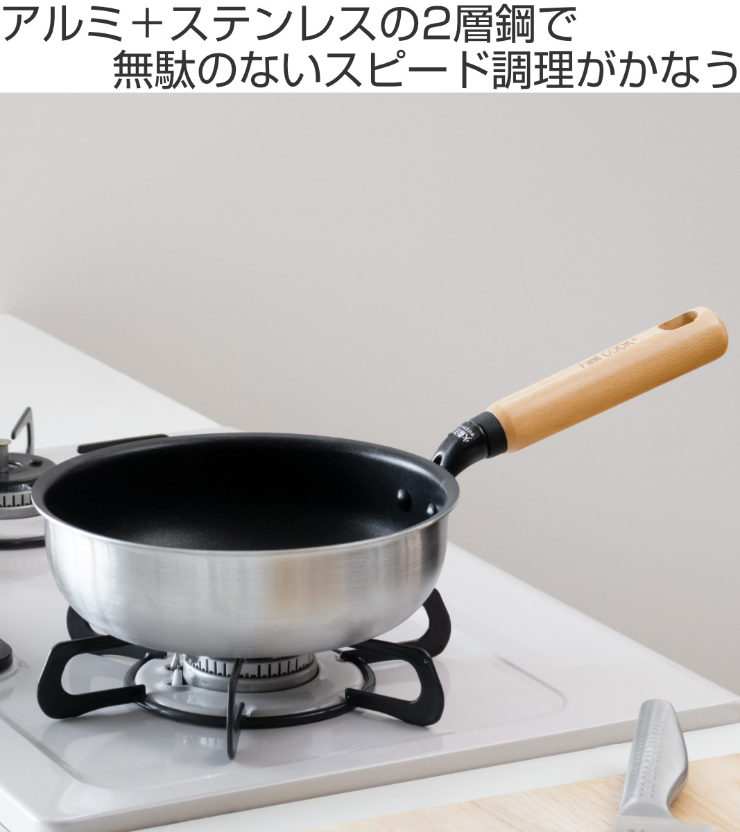 無駄のないスピード調理がかなう、アルミ+ステンレスの2層鋼フライパンです。熱伝導の良いアルミと保温力の高いステンレスを合わせているので、すばやく加熱でき、かつ全体にムラなく熱を伝えます。従来品と比較しても加熱の早さ、沸騰力が違います。