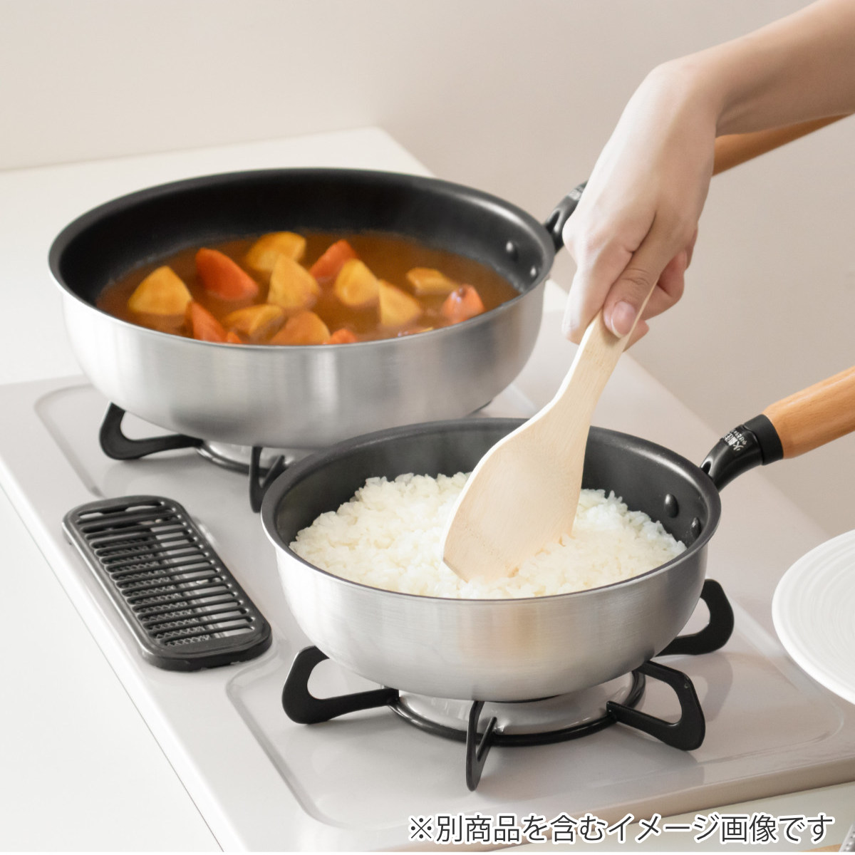 | 材質 | 本体:ステンレス鋼、アルミニウム合金 取っ手:天然木 表面加工:ふっ素樹脂塗膜加工(内面) |