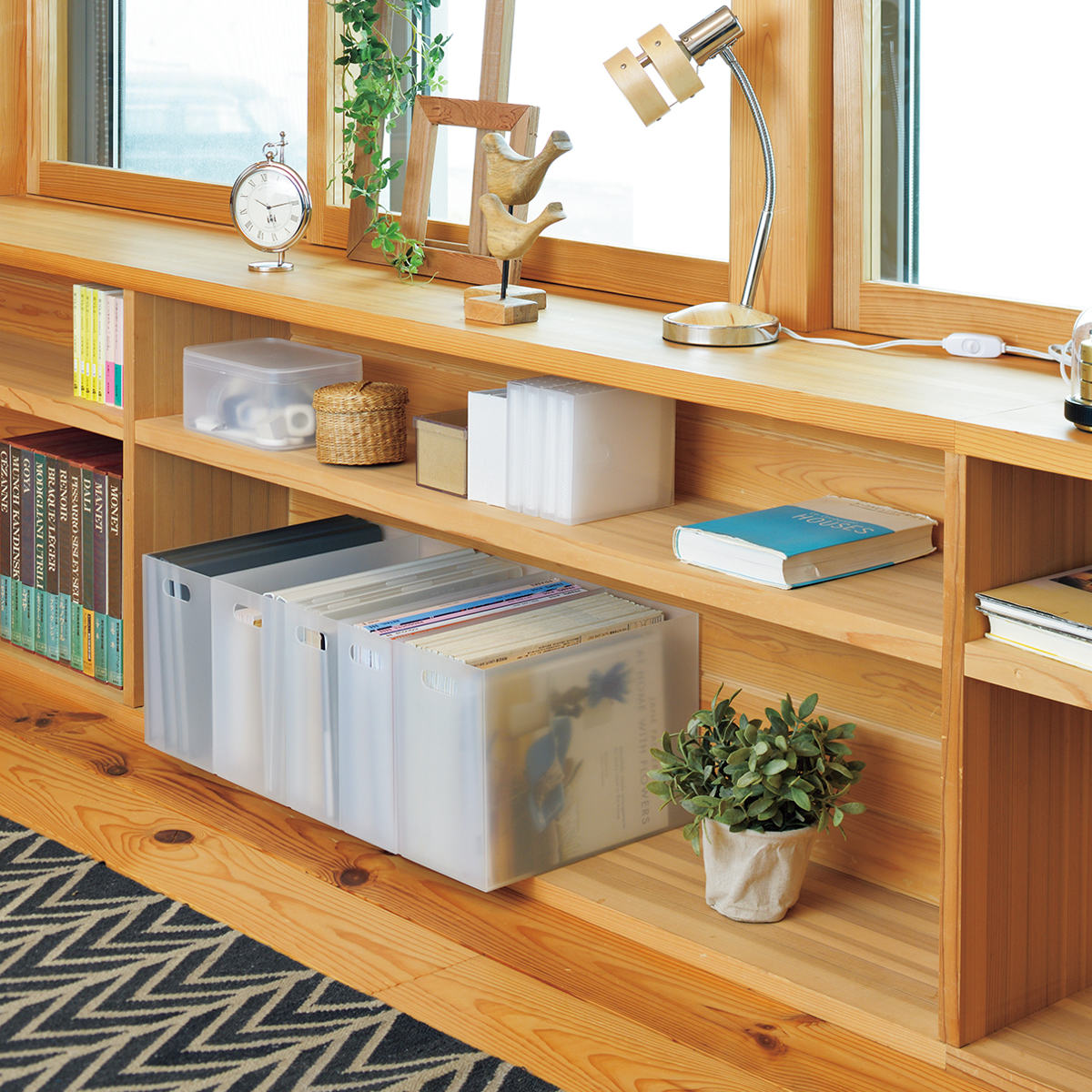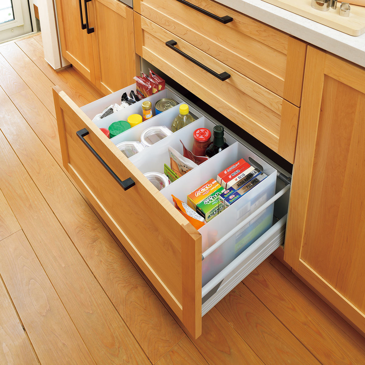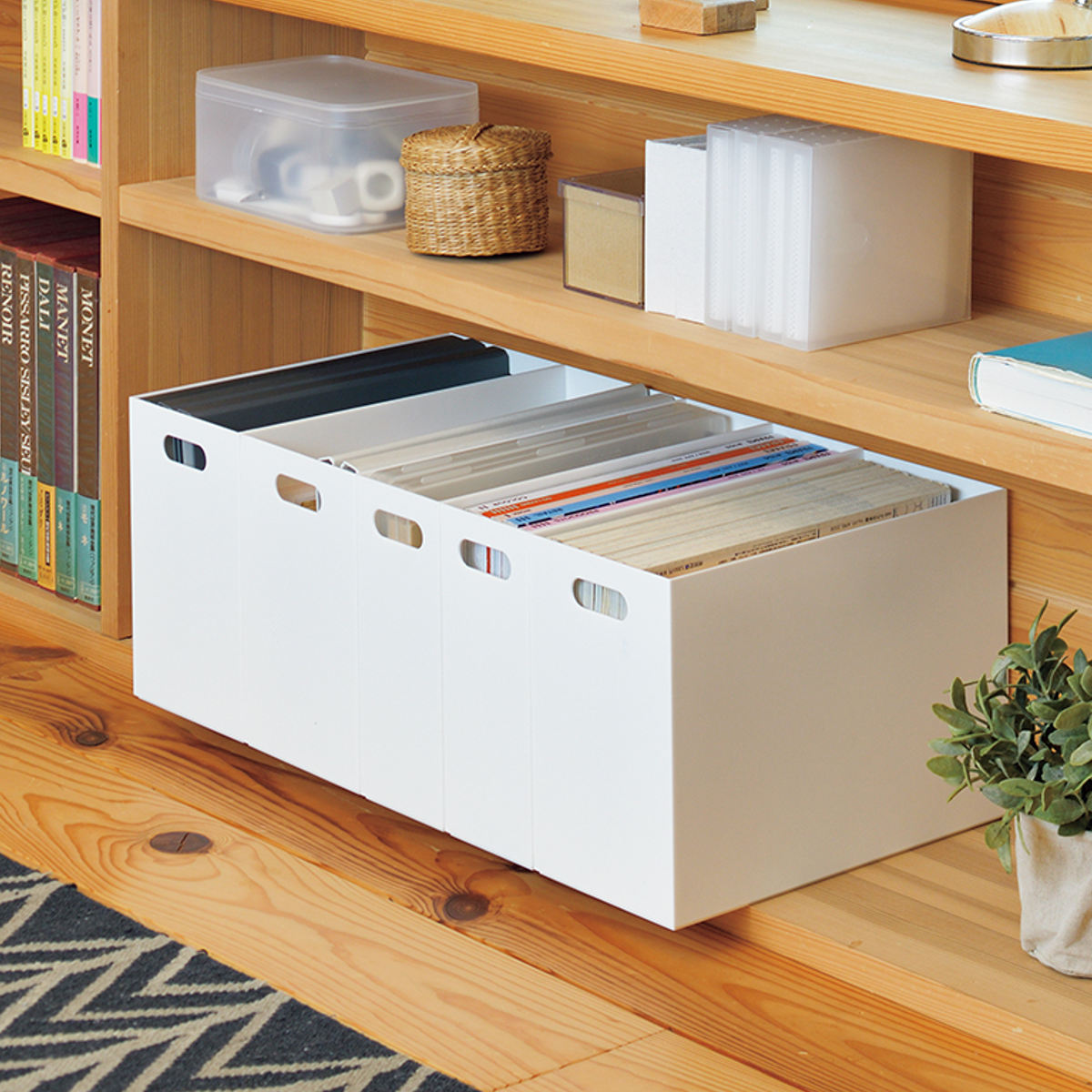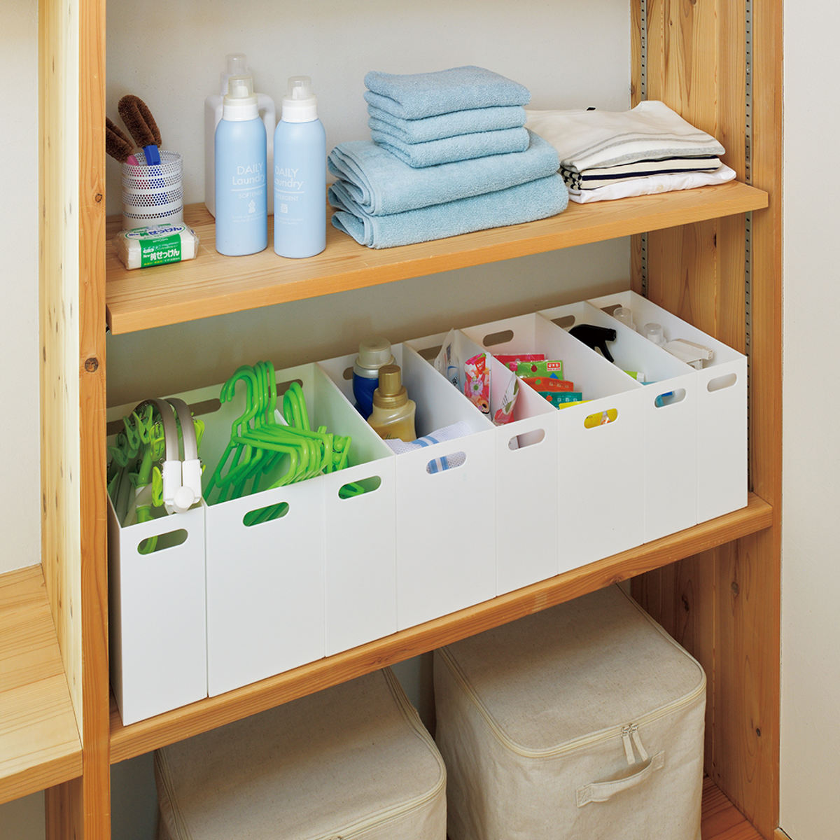 デスクのファイル・書類整理はもちろん、キッチンでは調味料やストック、レシピノートの収納に。洗面所やランドリースペースでは、スプレーや洗剤ボトル、ハンガーなどの仕分けにも使えます。アイデア次第で使い方が広がります。