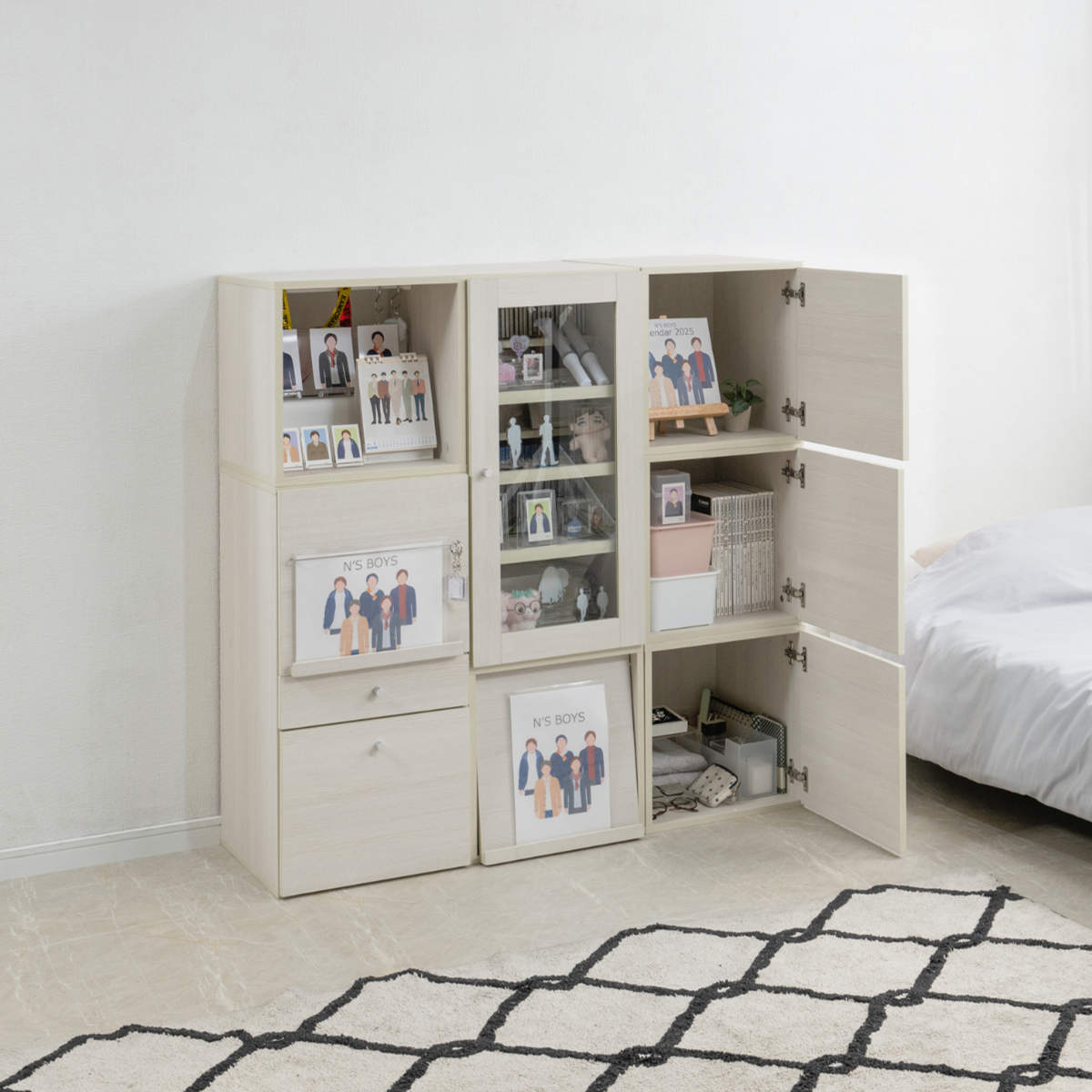 大切なグッズを収納する棚を自由に作れるラック「前扉&引出しタイプ」です。2種類のラックと4種類のボックスを組み合わせれば、魅せるも隠すもどちらも可能。ラックは、同じシリーズのキューブボックス2個分と同じ高さなのでどの組み合わせでもぴったりと揃い、お好きなレイアウトを楽しめます。