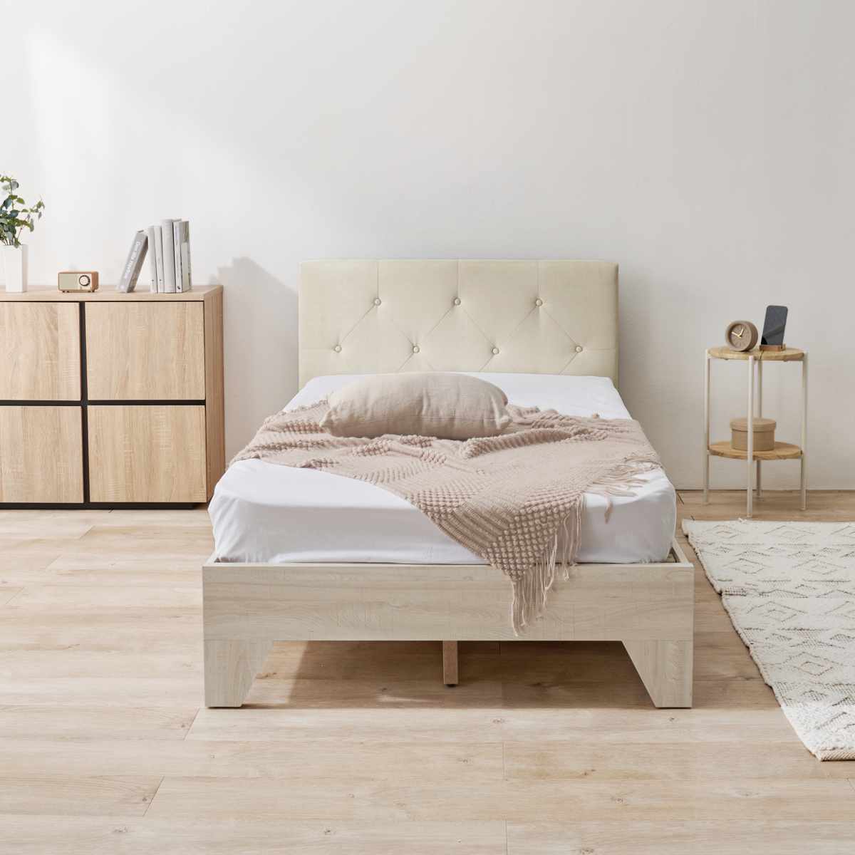 | 材質 | ベッド:〈フレーム〉プリント紙化粧パーティクルボード、〈張地〉ポリエステル マットレス:〈主材〉ボンネルコイル(コイル数:320個)、〈張地〉ポリエステル |