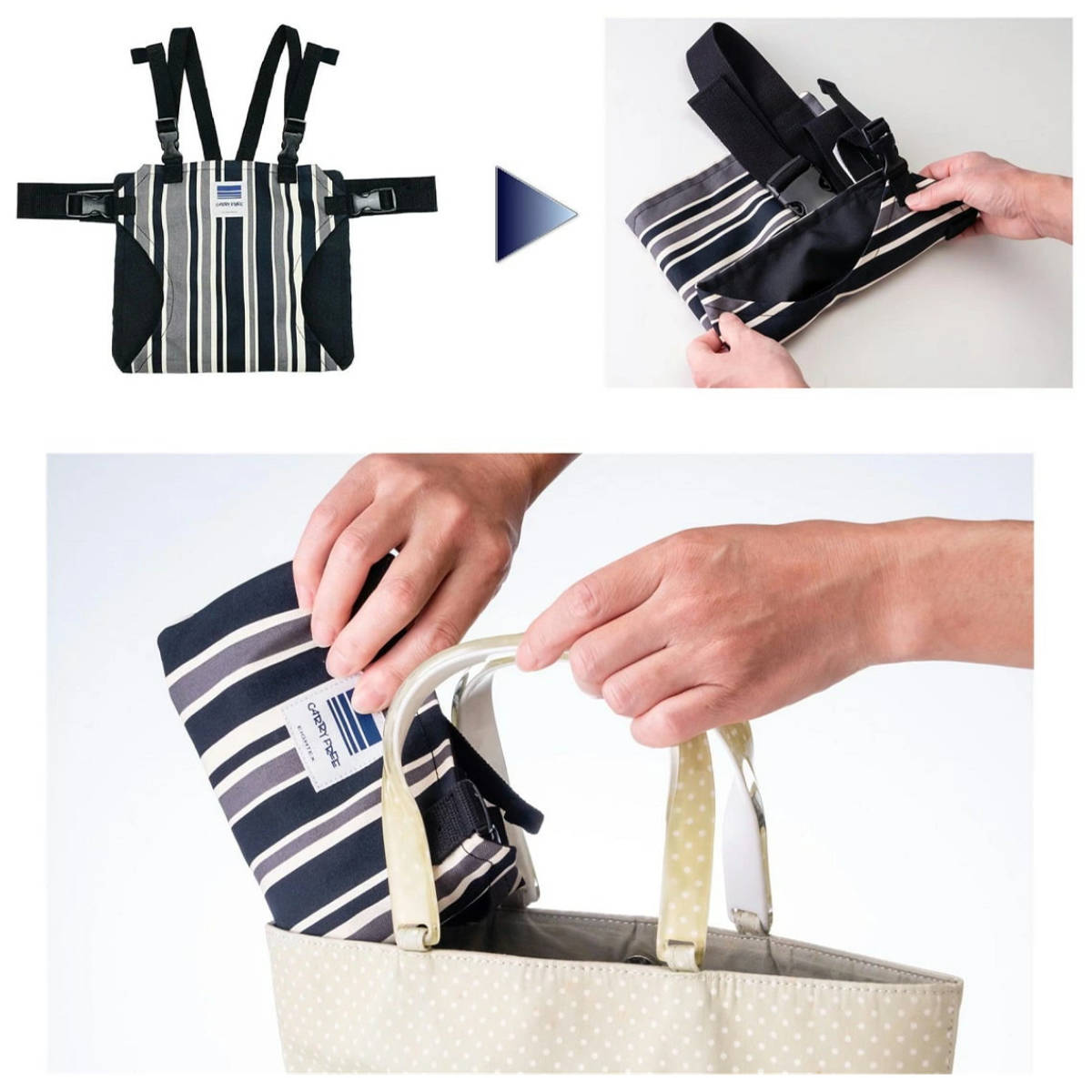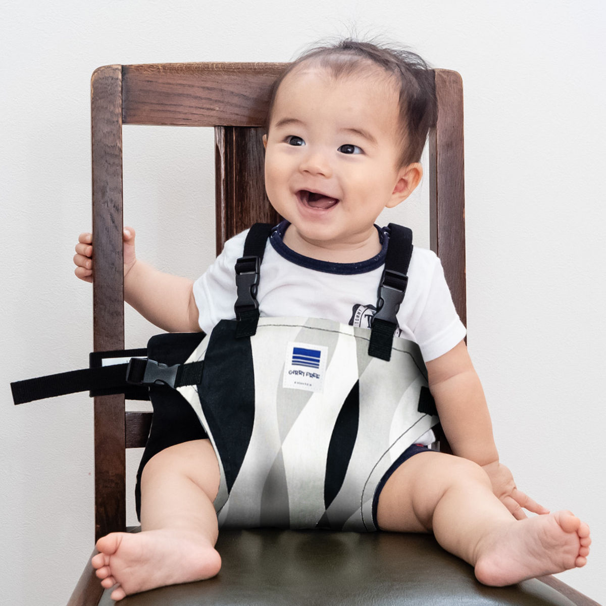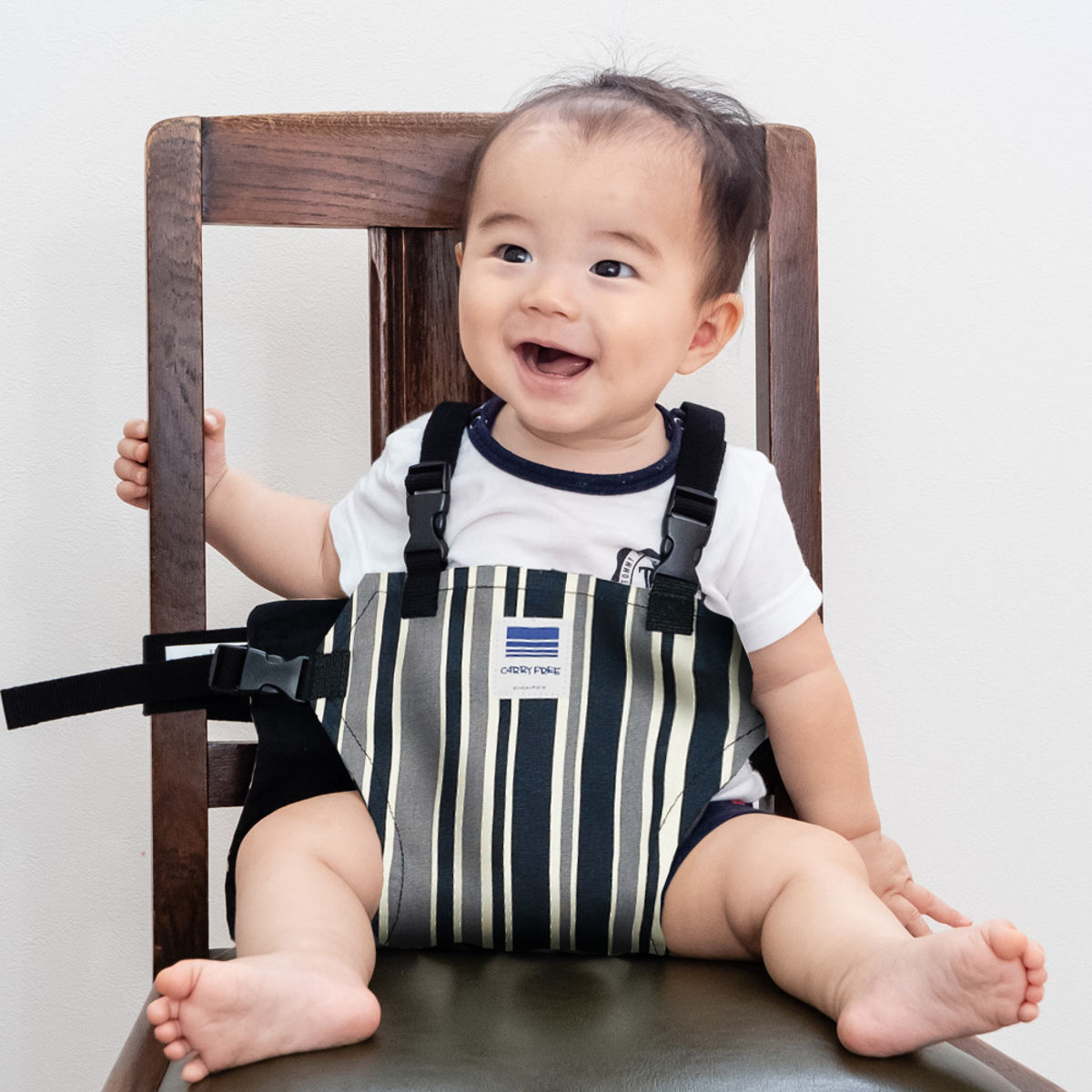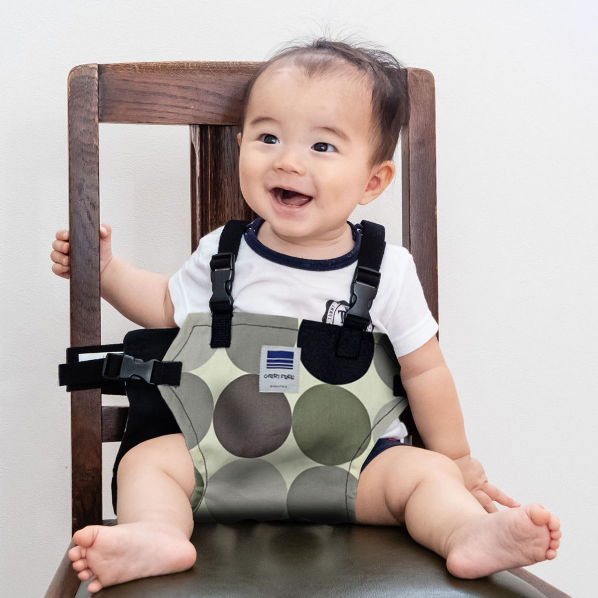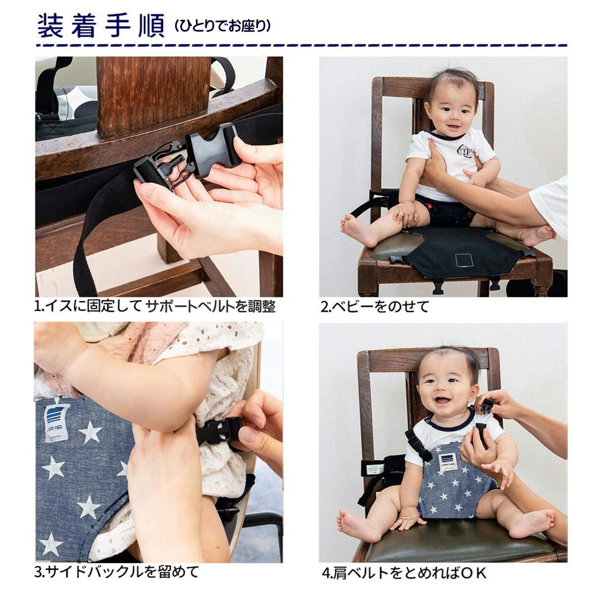 外出先やレストランなどで、大人用のイスやベルトのないイスに取り付けられる安全補助ベルトです。ショルダーベルトでお子様の肩部分を「ホールド」するので、前のめりになっても安心。急な立ち上がりも制御します。取り付けた後もだんだん下にズレてくることもないのでお食事がもっと楽しくなります。