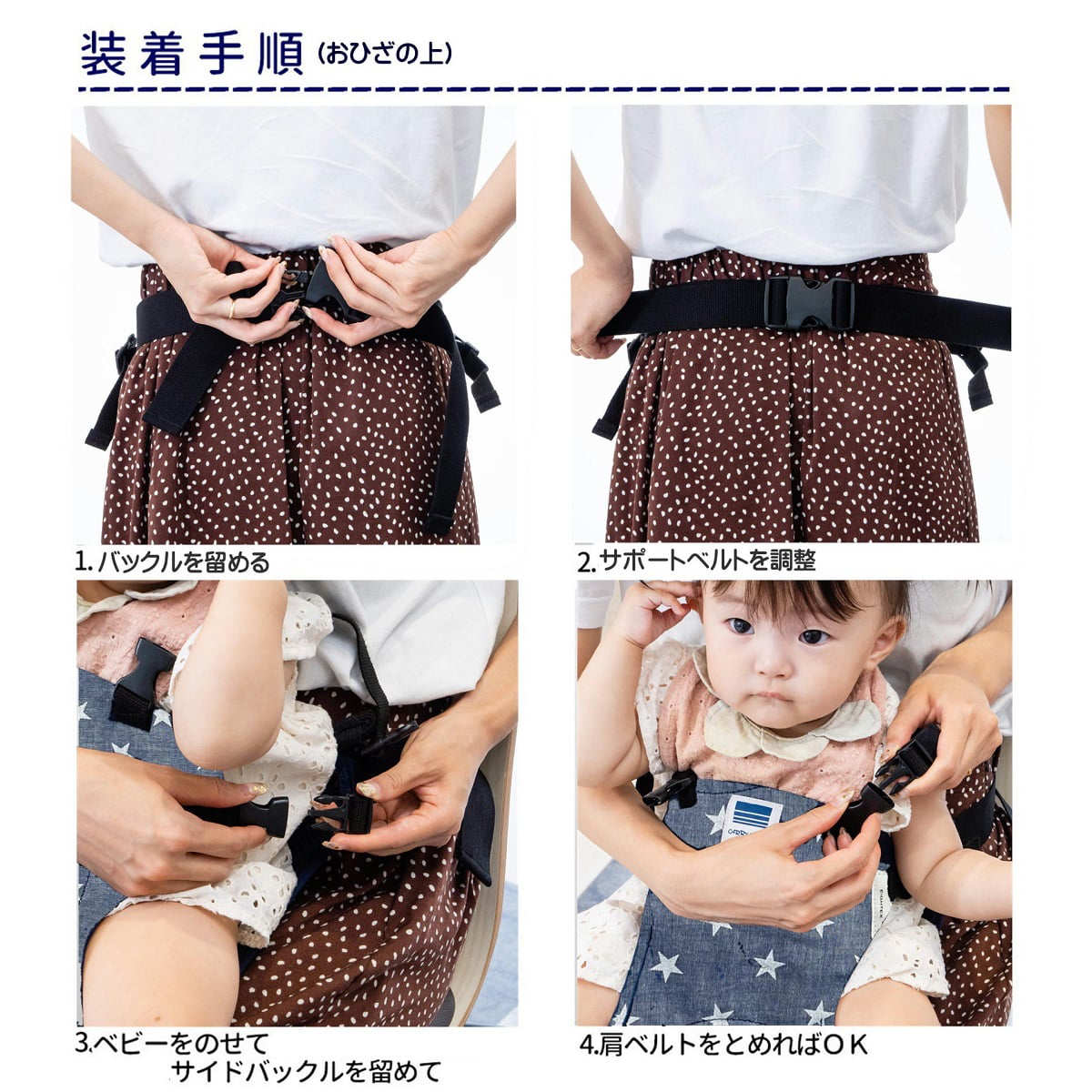 おうちの方の腰に装着すれば、ひざの上で安心してお食事ができます。両手が空くのでお食事サポートや、大人も同時に食事が楽しめます。装着するサポートベルトは幅広で安心、腰への食い込みも軽減します。