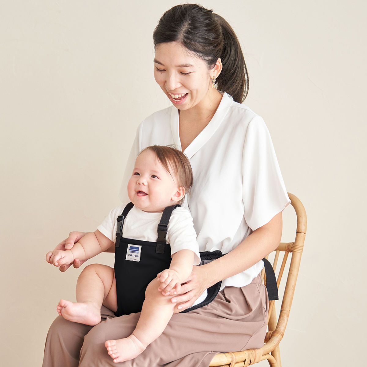 おうちの方の腰に装着すれば、ひざの上で安心してお食事ができます。両手が空くのでお食事サポートや、大人も同時に食事が楽しめます。装着するサポートベルトは幅広で安心、腰への食い込みも軽減します。