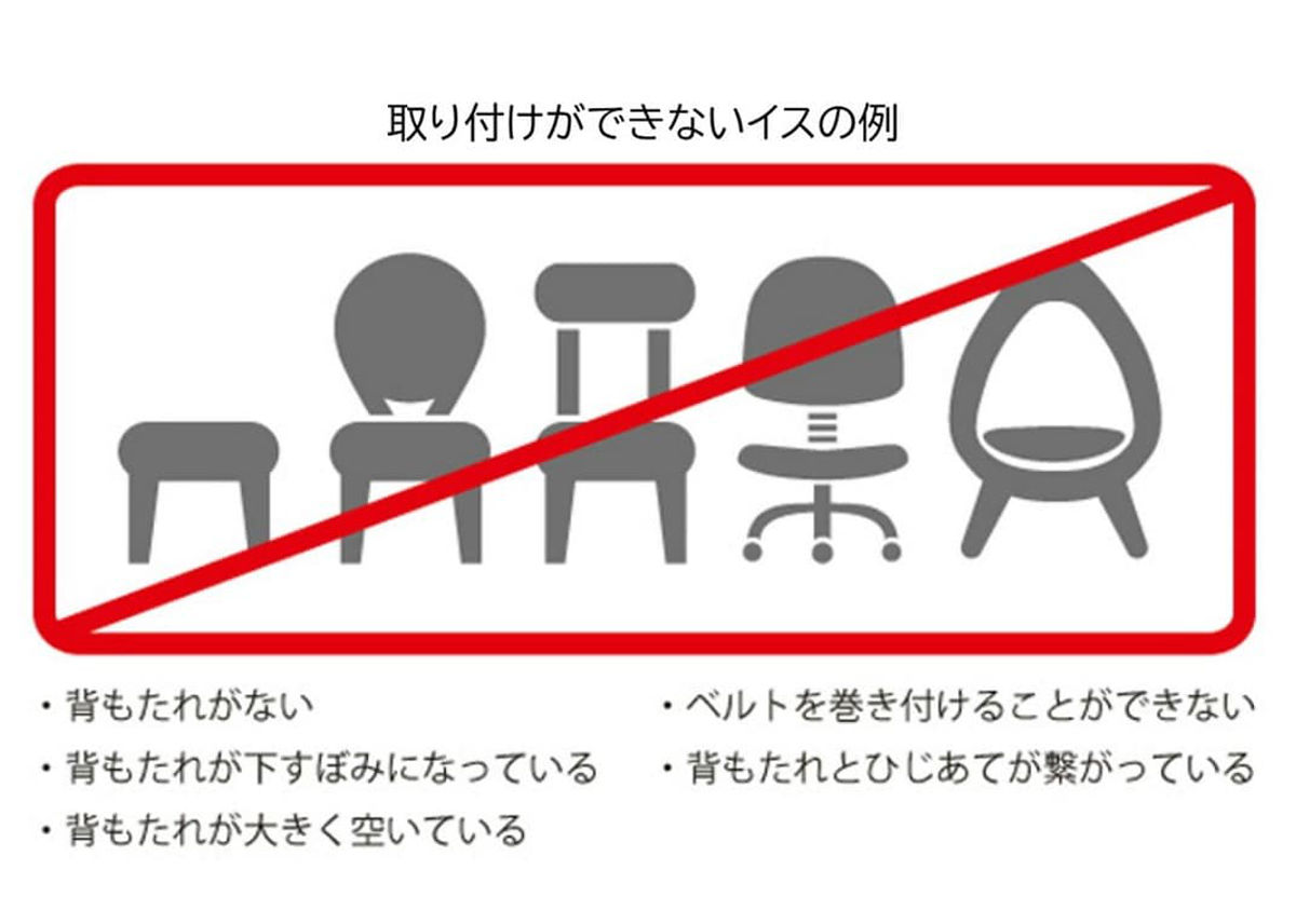 | 注意事項 | ※当製品は、ひとりでお座りができるお子様用の簡易補助具です。ひとりでお座りができないお子様には使用できません。 (取り付けができないイスの例) ・背もたれがない ・ベルトを巻き付けることができない ・背もたれが下すぼみになっている ・背もたれとひじあてが繋がっている ・背もたれが大きく空いている ※商品ページ内には別の商品を含む画像を使用しています |