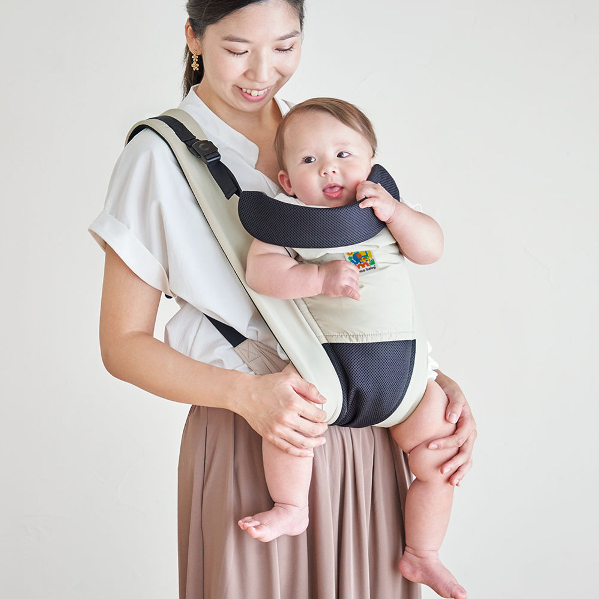 新生児の寝かせ抱きから3歳まで、5通りに使える抱っこひもです。ウエストベルトがないので妊娠中や帝王切開のあともお腹を締め付けずに使用できます。表生地は撥水性のある生地で汚れにくく、裏地はメッシュ生地を使用しているので洗濯しても乾きやすいのでこまめに洗濯できます。