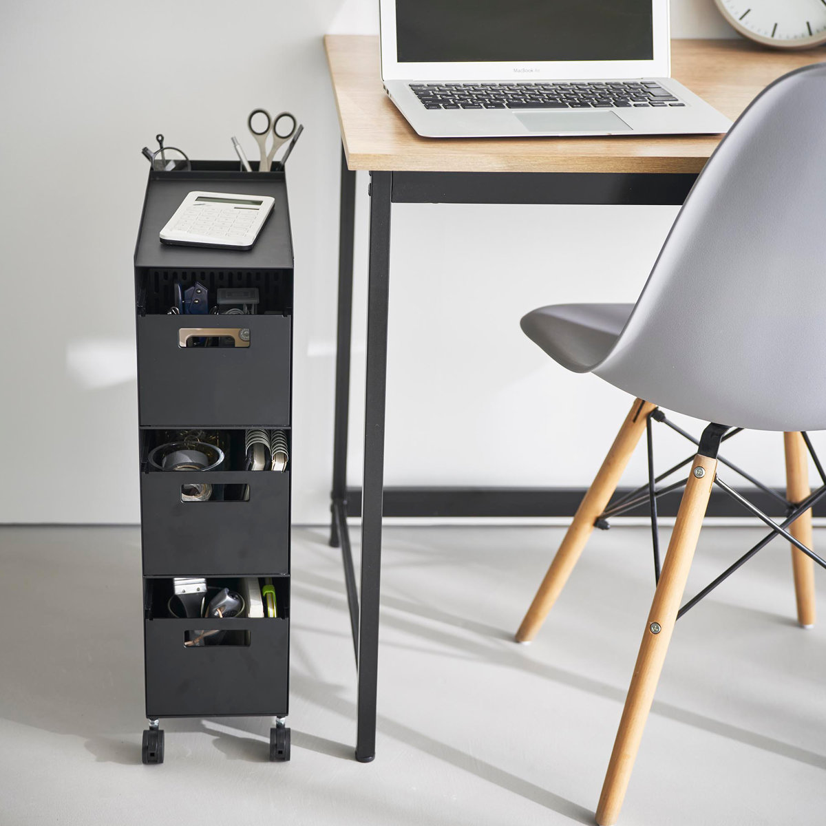 デスクサイドでは、文房具や書類の収納に。デスク下にも置ける高さで、デスク周りがすっきり片付きます。