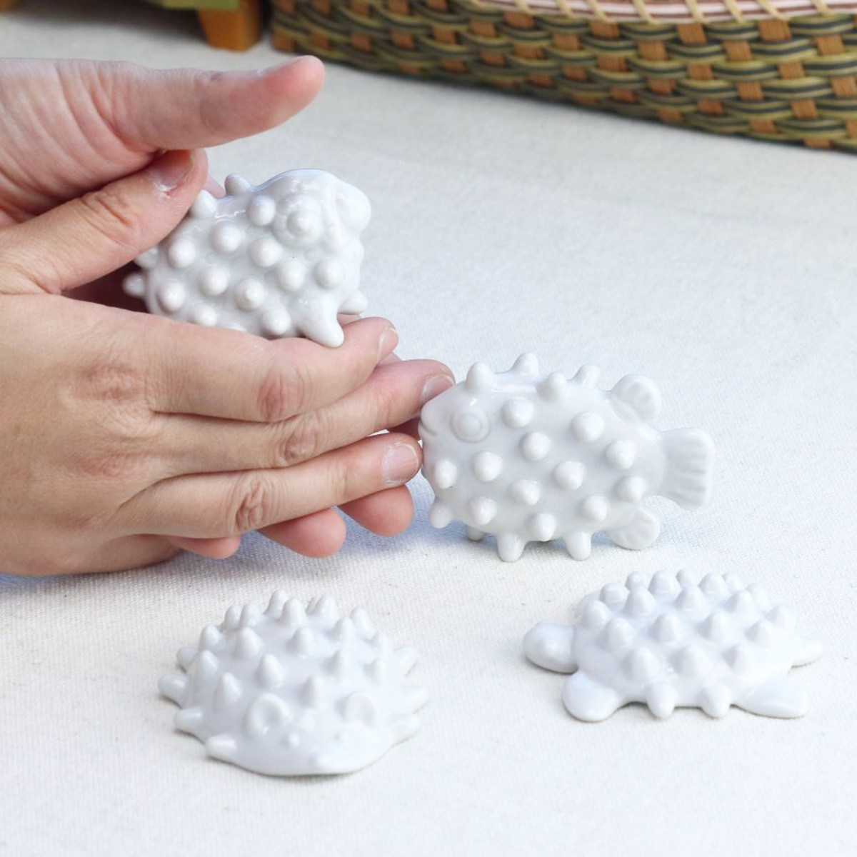 ハリネズミ、カメ、ヒツジ、マンボウの形をしたかわいらしい陶器製のツボ押しグッズです。手のひらにすっぽり収まるサイズなので、手に持って握るだけでツボにフィット。仕事中のちょっとした合間に手元や足元を気軽にケアできます。