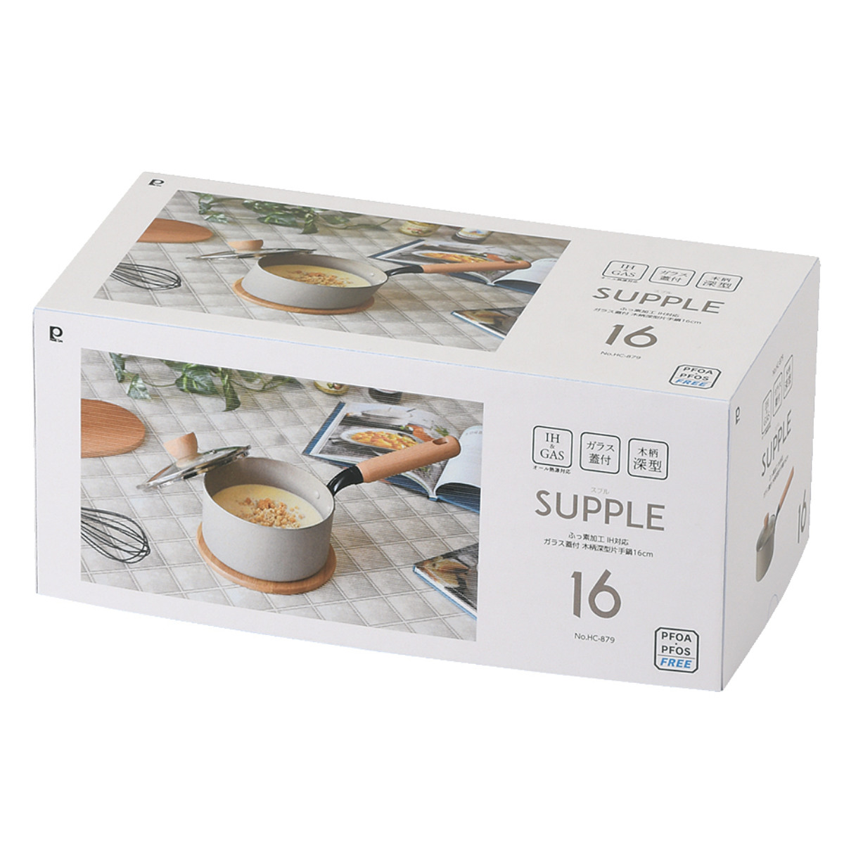 | 材質 | 本体:アルミニウム合金 内面:ふっ素樹脂塗膜加工 外面:焼付け塗装 はり底:ステンレス鋼(クロム16%) 取っ手:天然木 蓋:強化ガラス(全面物理強化) 縁リング:ステンレス鋼 つまみ:天然木 |