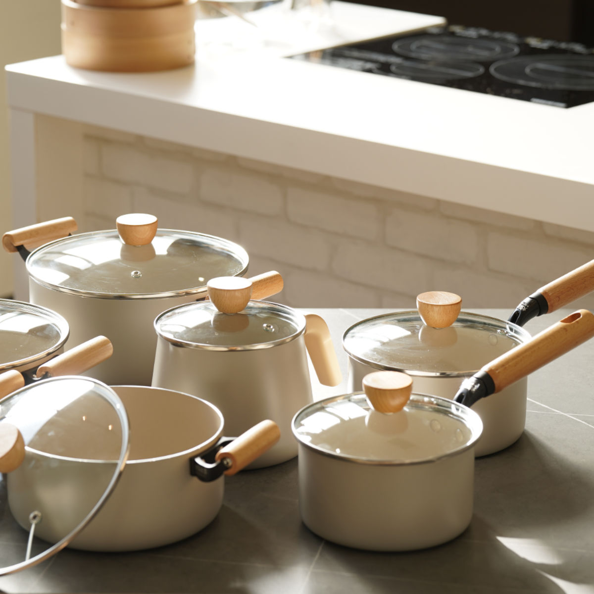 やさしいベージュカラーと天然木が魅力の「スプル」シリーズです。温かみのあるデザインで、毎日の料理を心地よく楽しくしてくれます。マルチポット、片手鍋や両手鍋と豊富なラインナップとなっており、シリーズで揃えてお使いいただくことで、よりナチュラルテイストなキッチン空間をつくれます。