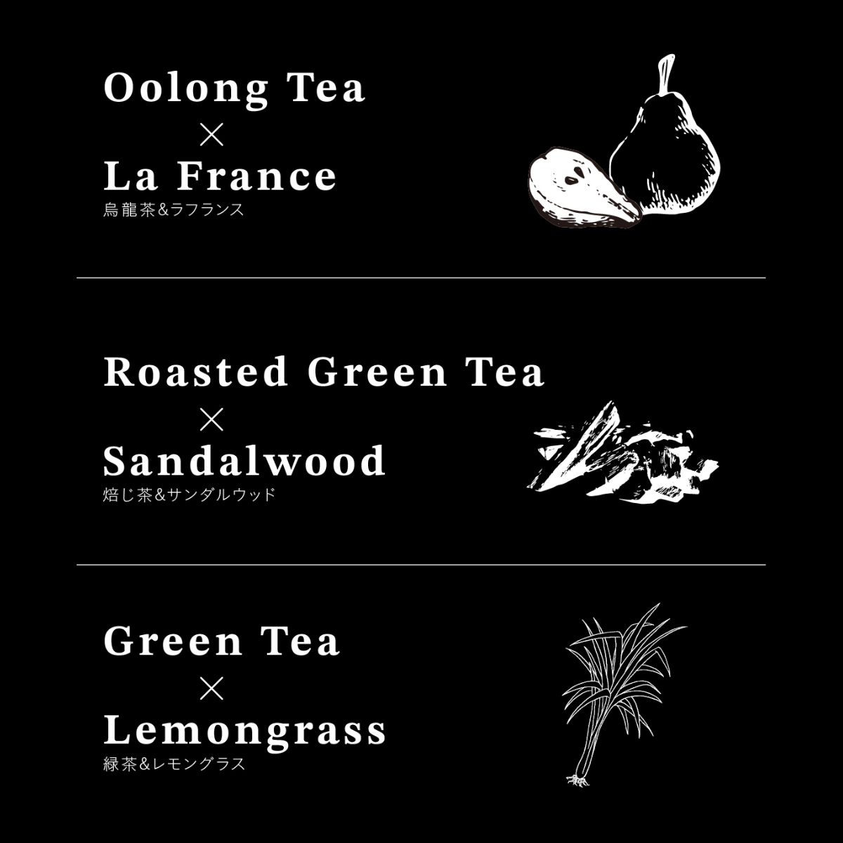 | 種類 | 烏龍茶×ラフランス、焙じ茶×サンダルウッド、緑茶×レモングラス |