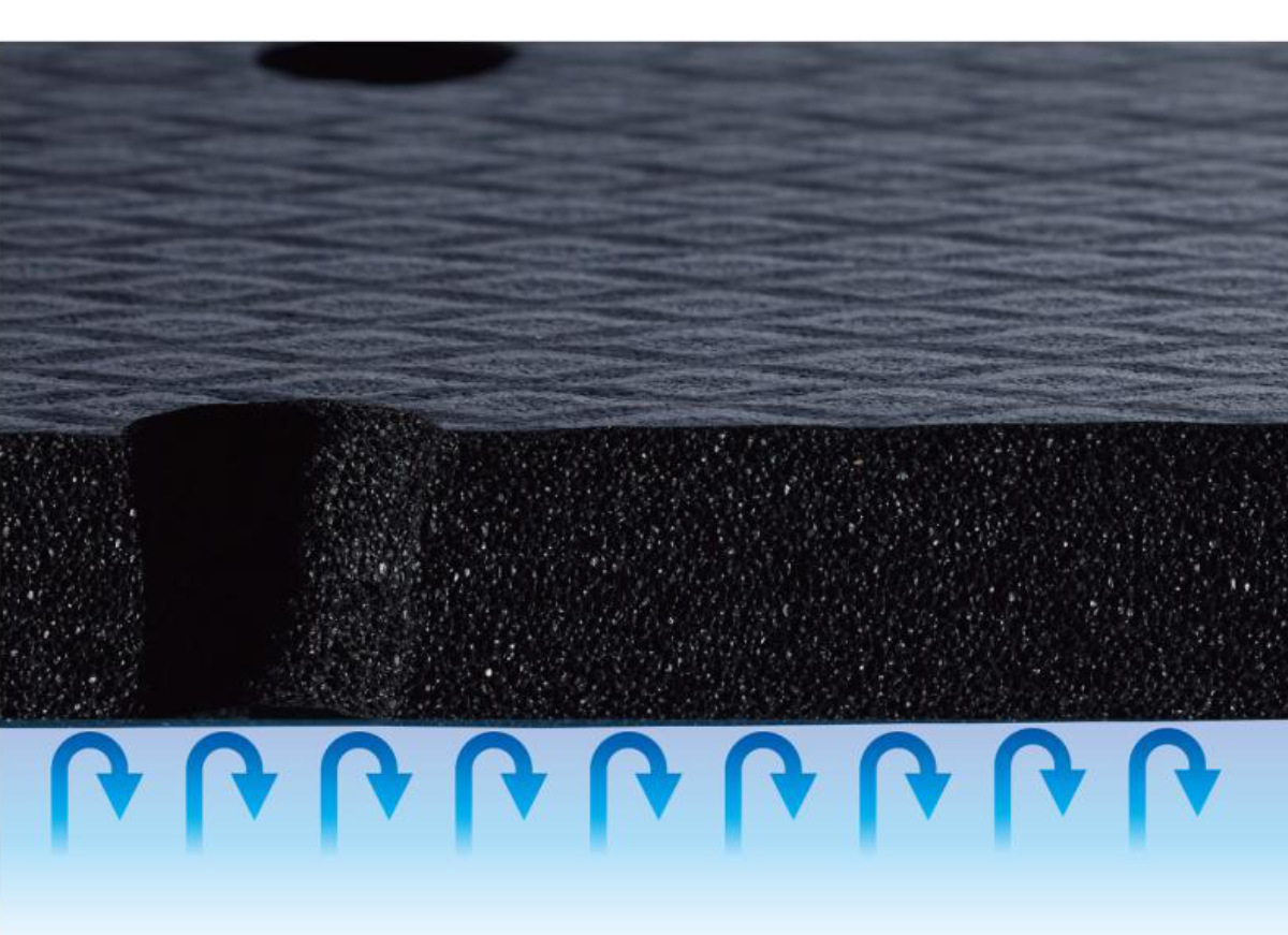 耐油性を持ちながら高倍率に発泡した1.6cmの厚みのあるクッション層が立ち仕事による疲労を軽減、転倒時のケガ防止、底冷えなどにも効果を発揮します。