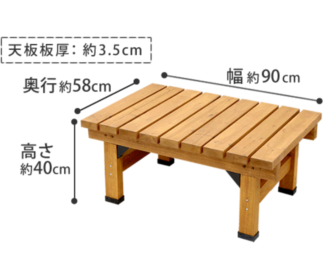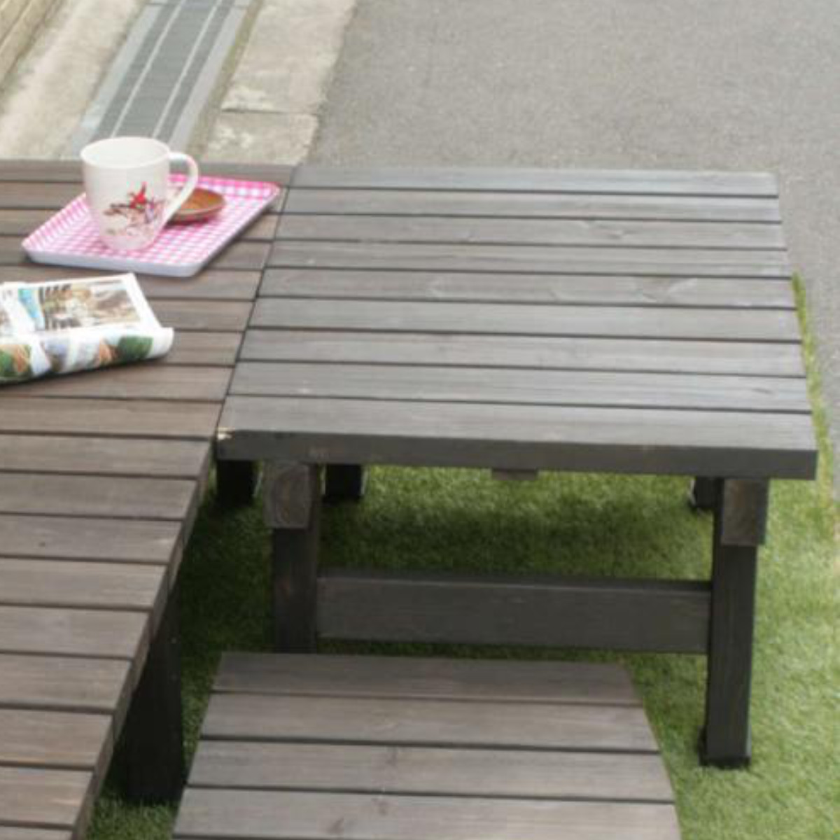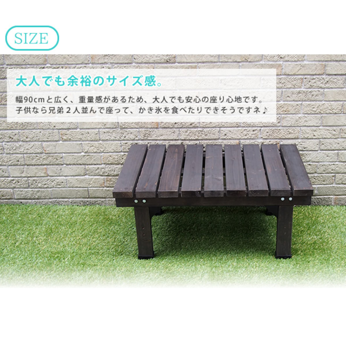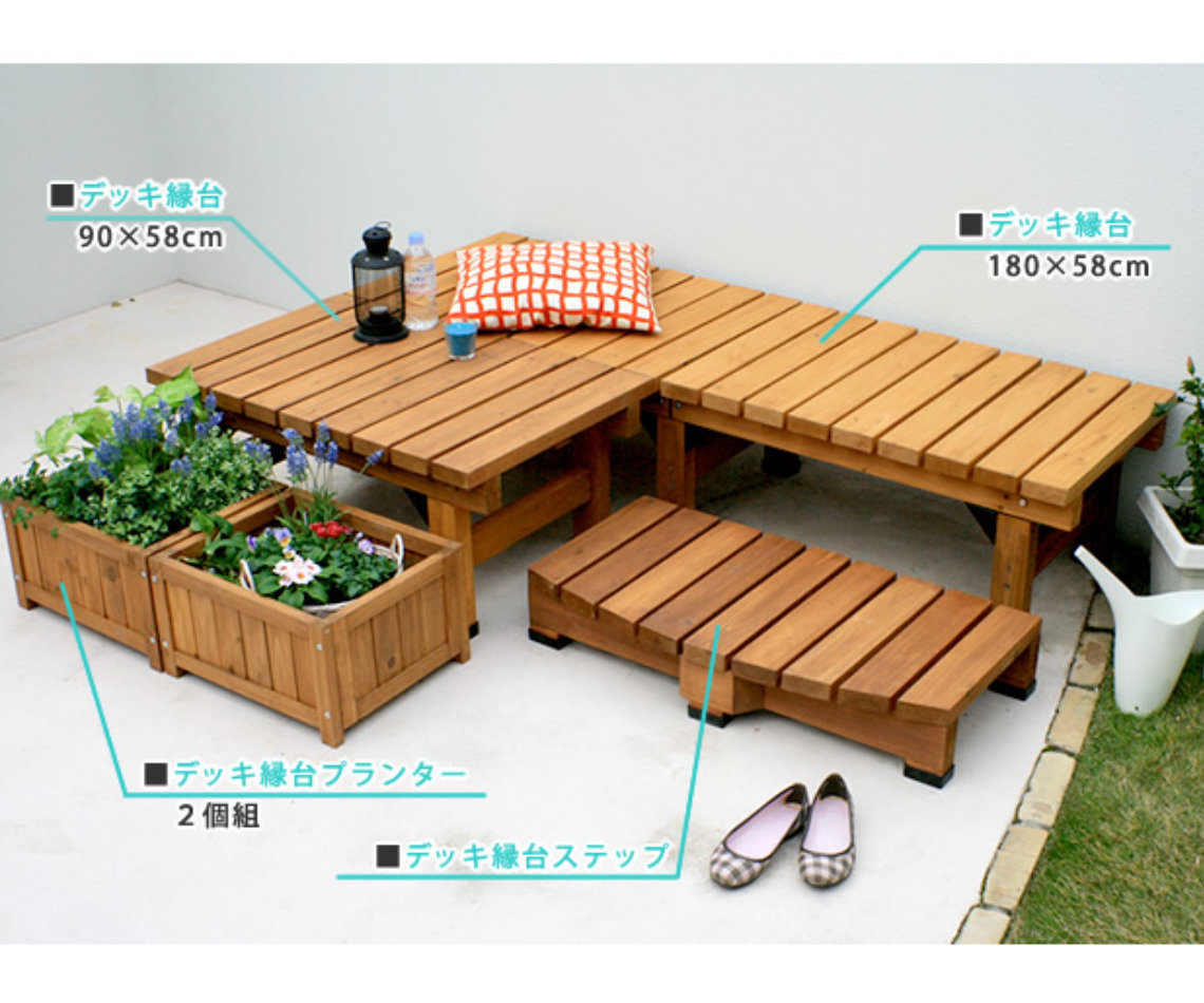 高さのあるウッドデッキに比べて、縁台は高さ約40cmと腰掛けやすい高さがポイントです。狭いお庭やマンションのベランダでも置くことができます。