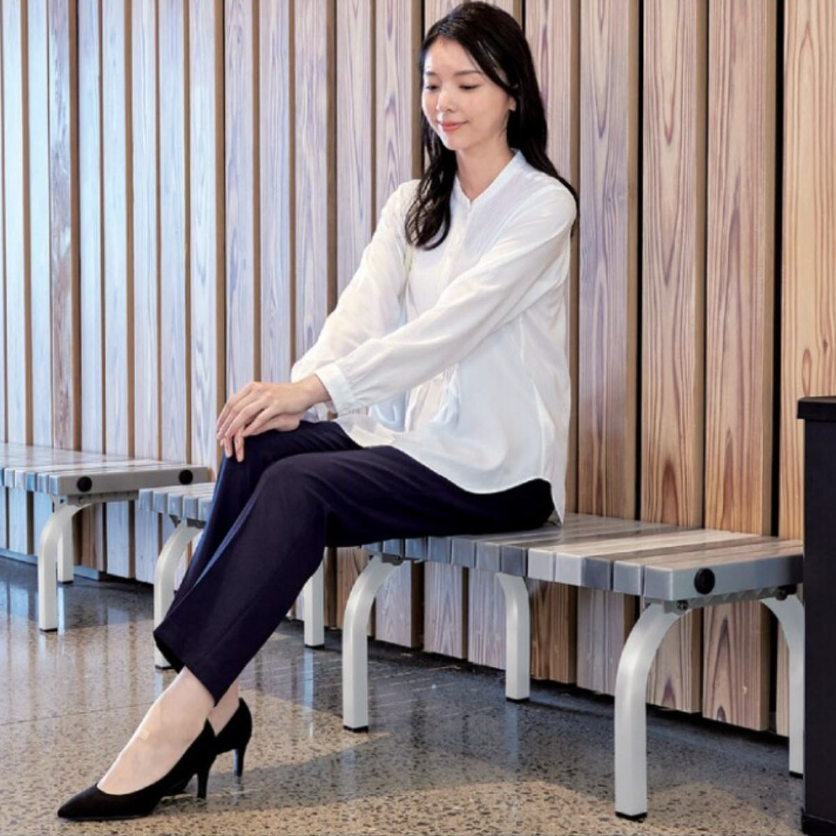 座面はグレーを基調としたシンプルで落ち着いた配色です。オフィスのロビー、体育館、美術館、動物園など幅広い場所で活躍します。