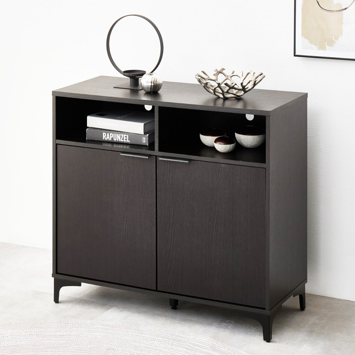 オープン収納と扉収納で小物をひとまとめに収納できるキャビネットです。