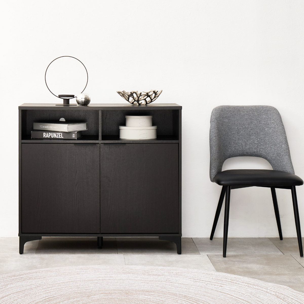木目調とブラックアイアンの異素材でキャビネット全体を引き締め、上品に魅せてくれます。