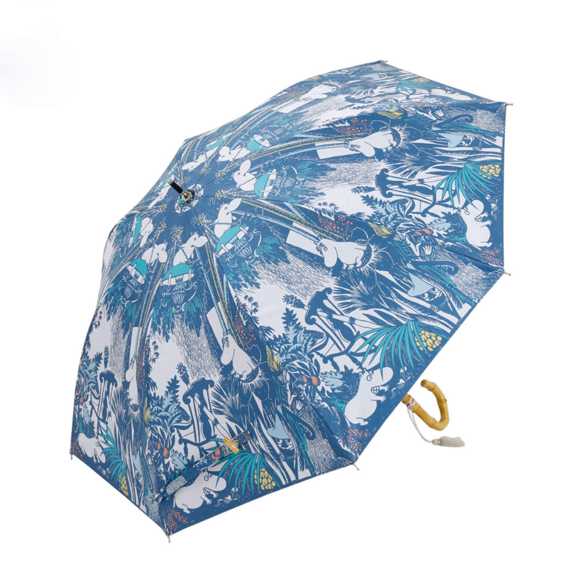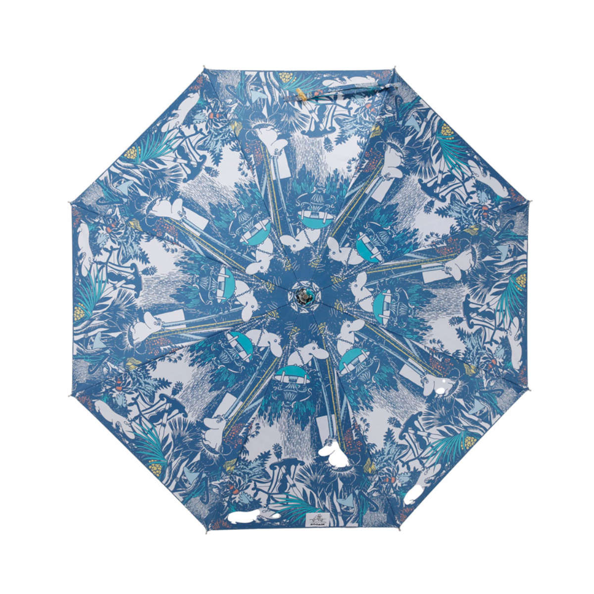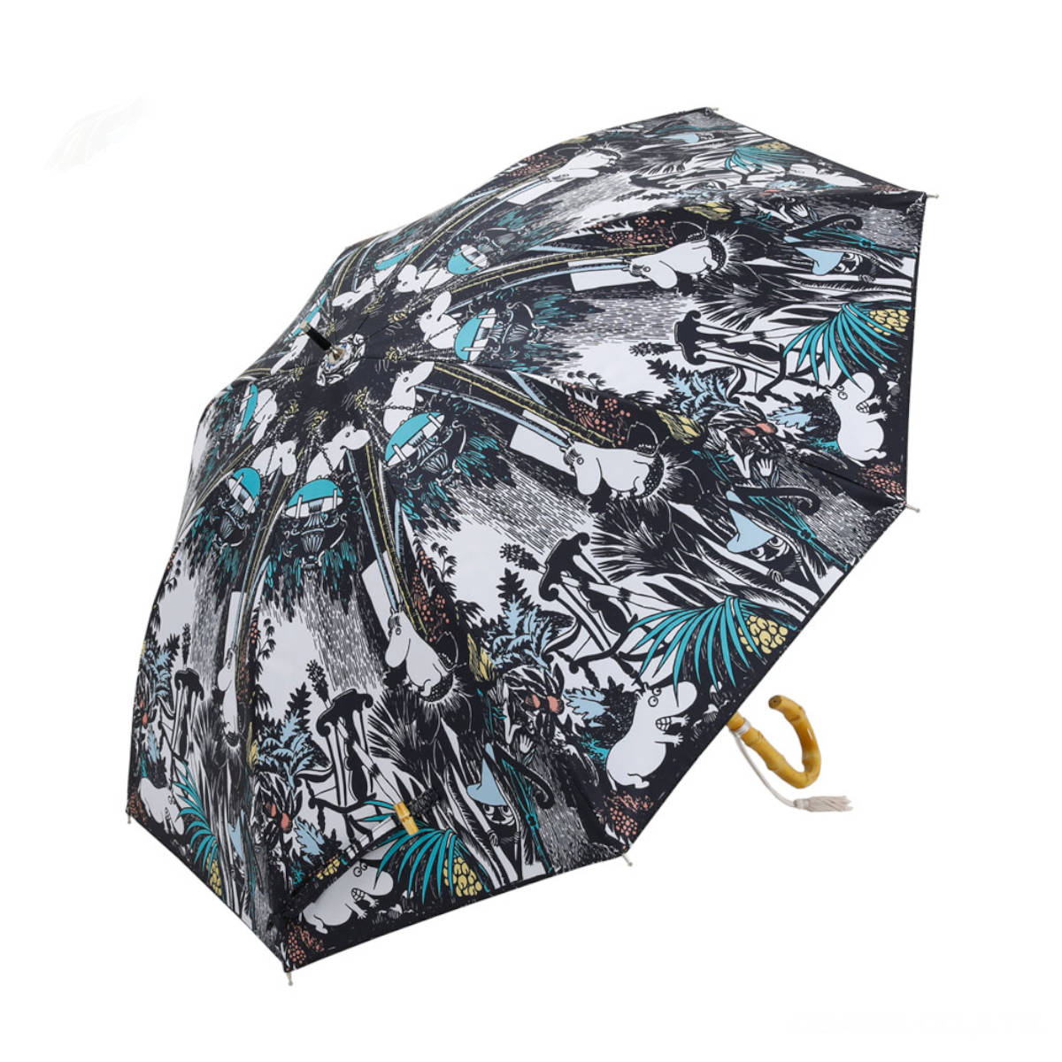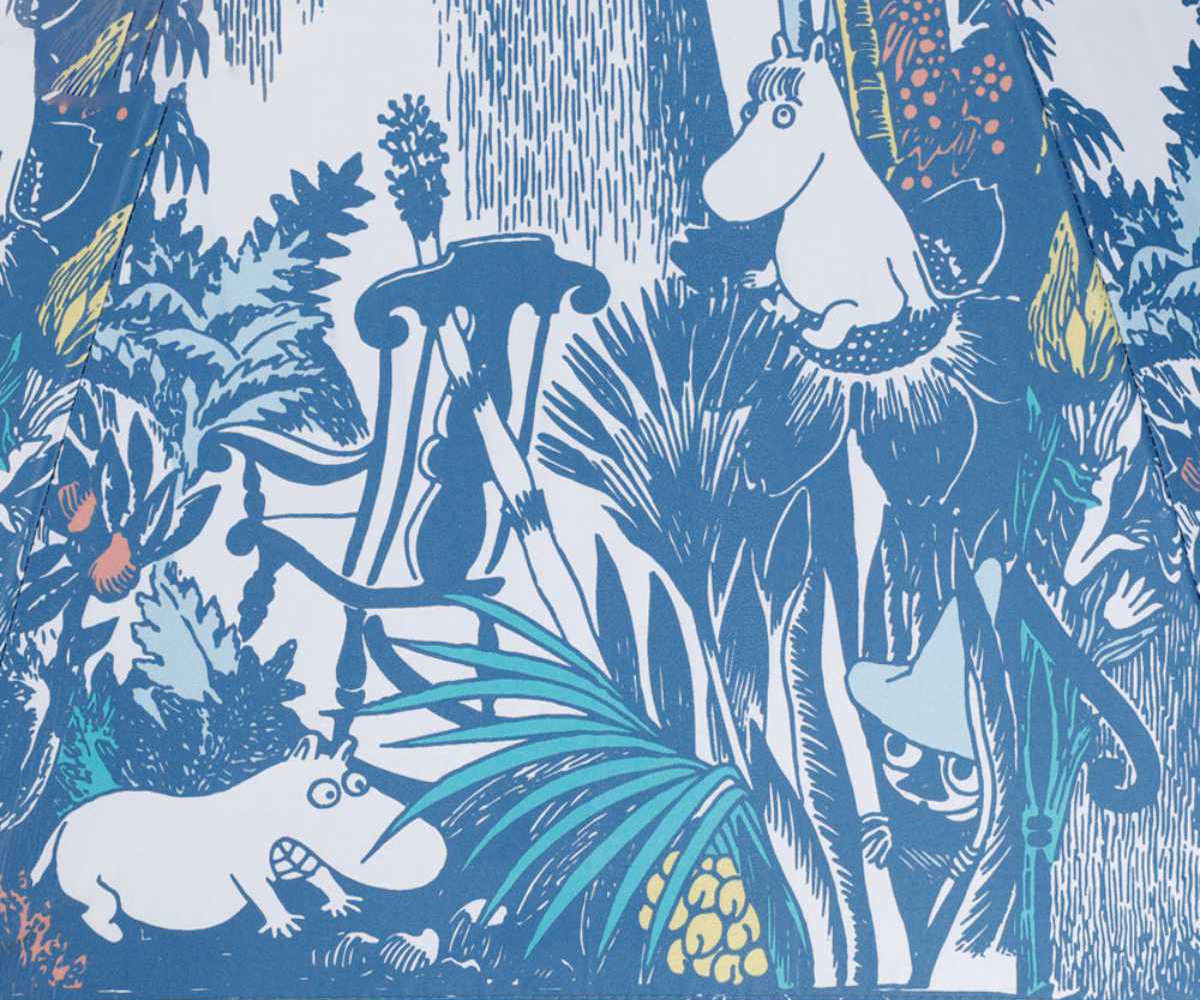 ムーミン原作小説「たのしいムーミン一家」から、ジャングルのようになったムーミン屋敷で遊ぶ、仲間たちの一場面を切り取ったデザインの晴雨兼用長傘です。繊細な原画のタッチと優しい色合いが、まるで絵本のように、日常の景色を豊かに彩ります。