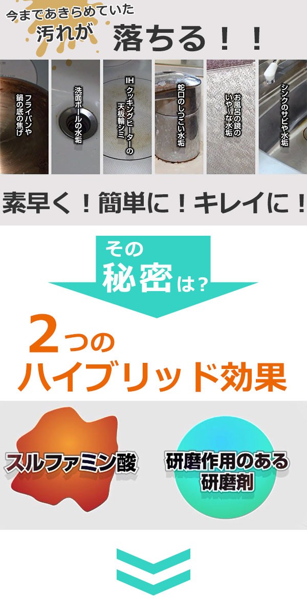 スルファミン酸が水垢を溶解、溶けた水垢を研磨剤が落とすハイブリット効果で頑固な水垢もスッキリ!水垢だけでなく、鍋、フライパンのコゲや工具のサビ、便器の黄ばみの除去など幅広くお使いいただけます。