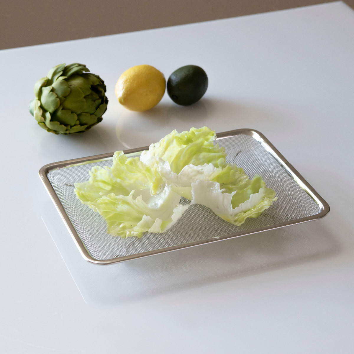 平らな形状なので、食材を広げたり並べることができ、効率よく水切りできます。