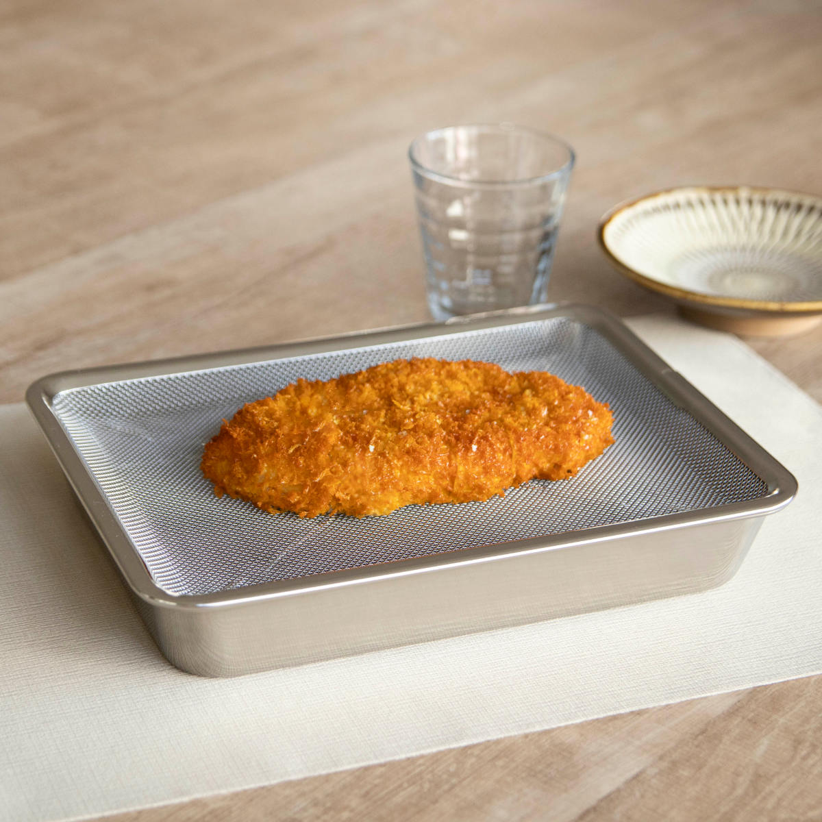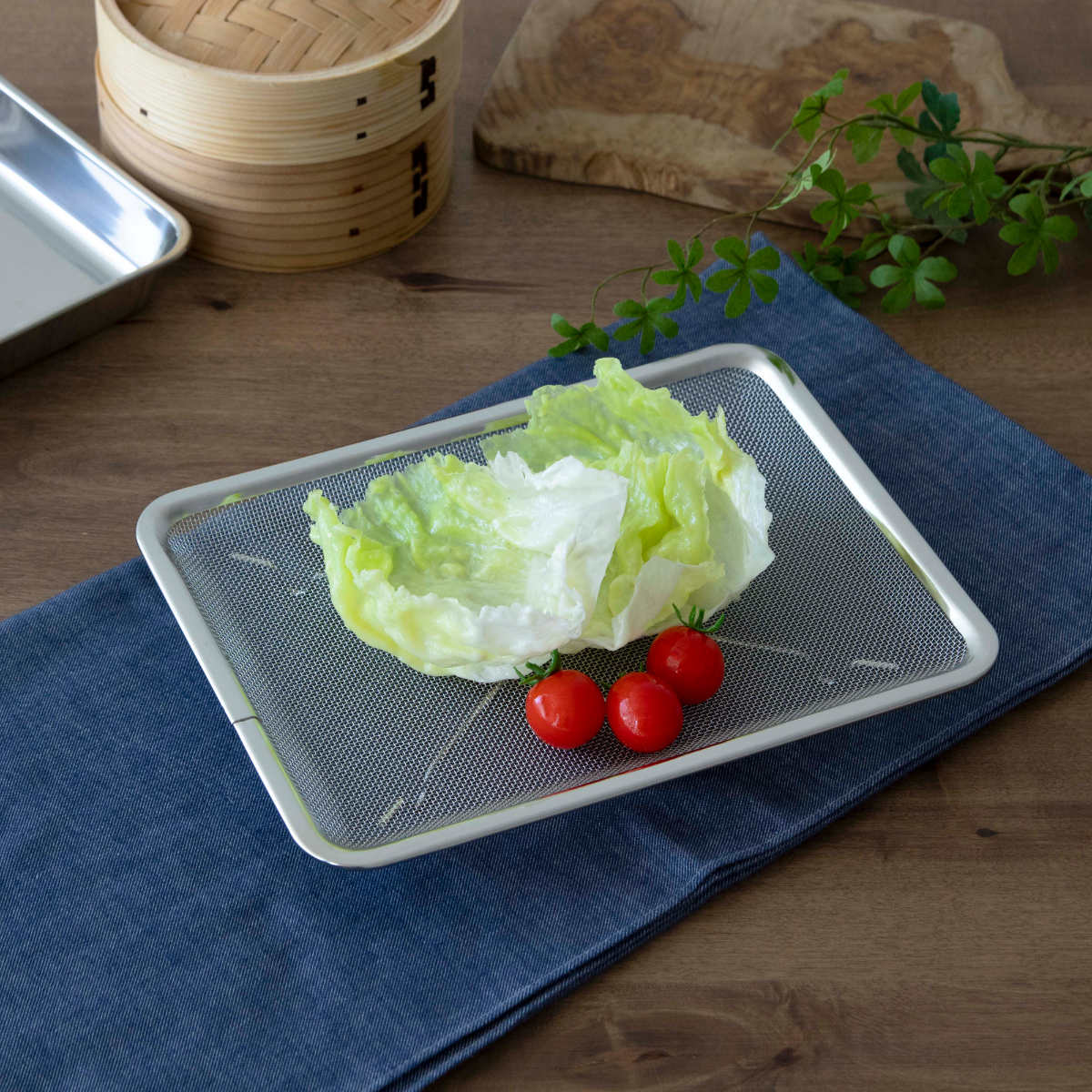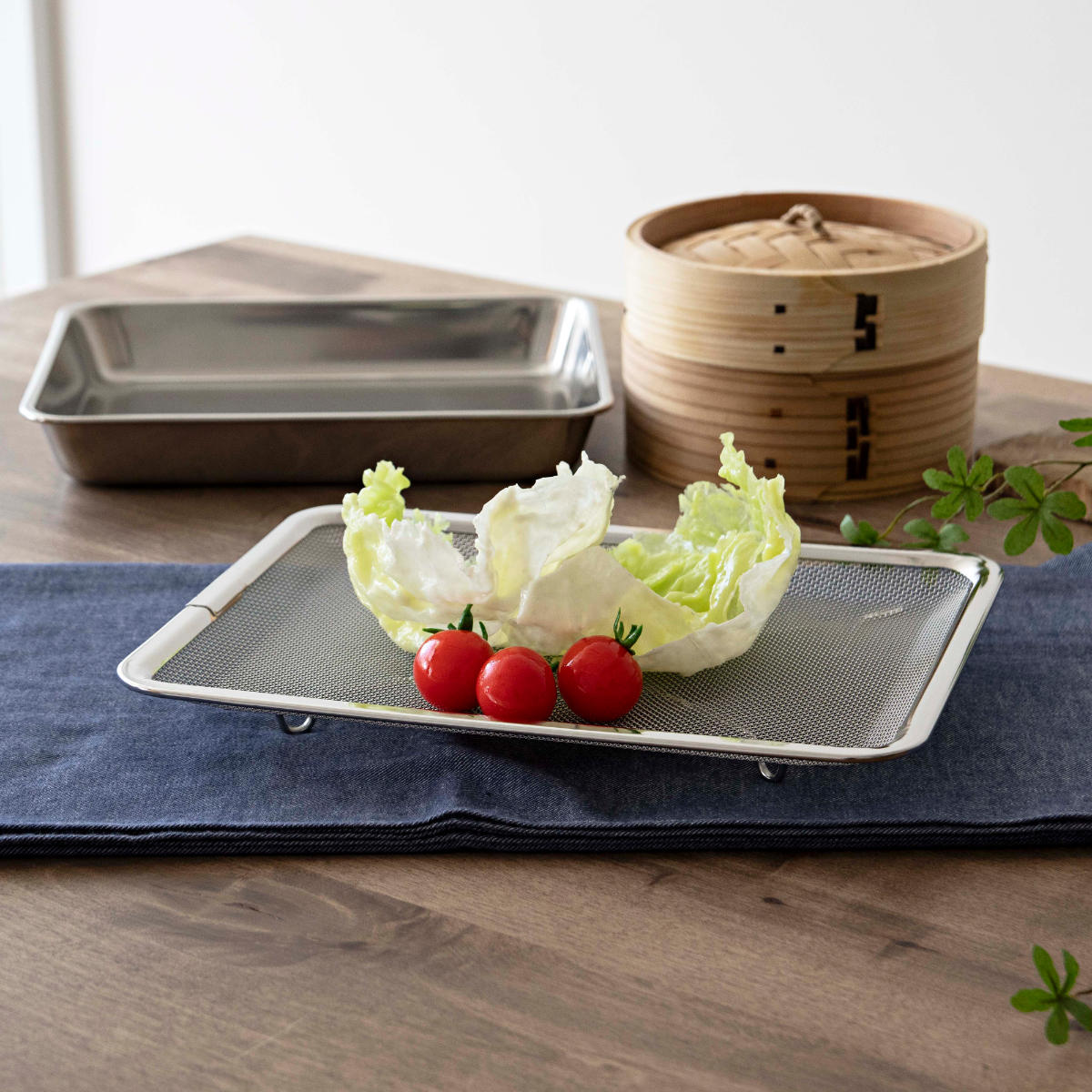 揚げ物の油切りや野菜の水切り、粗熱を取ってそのまま食卓に出したりと、毎日のお料理に幅広く活躍します。同シリーズの角バットと合わせても便利にお使いいただけます。