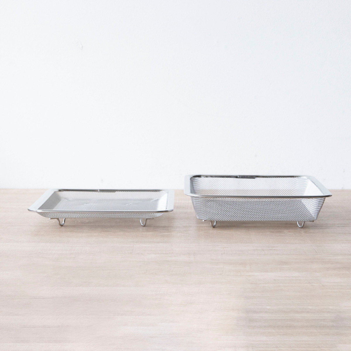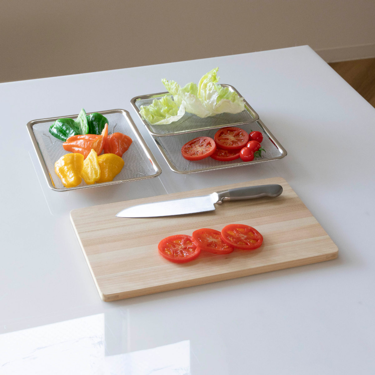 角トレーザルよりも深型の角ザルや角バットと組み合わせて使うこともできます。同じシリーズで揃えていただくことで、キッチンに統一感が生まれます。