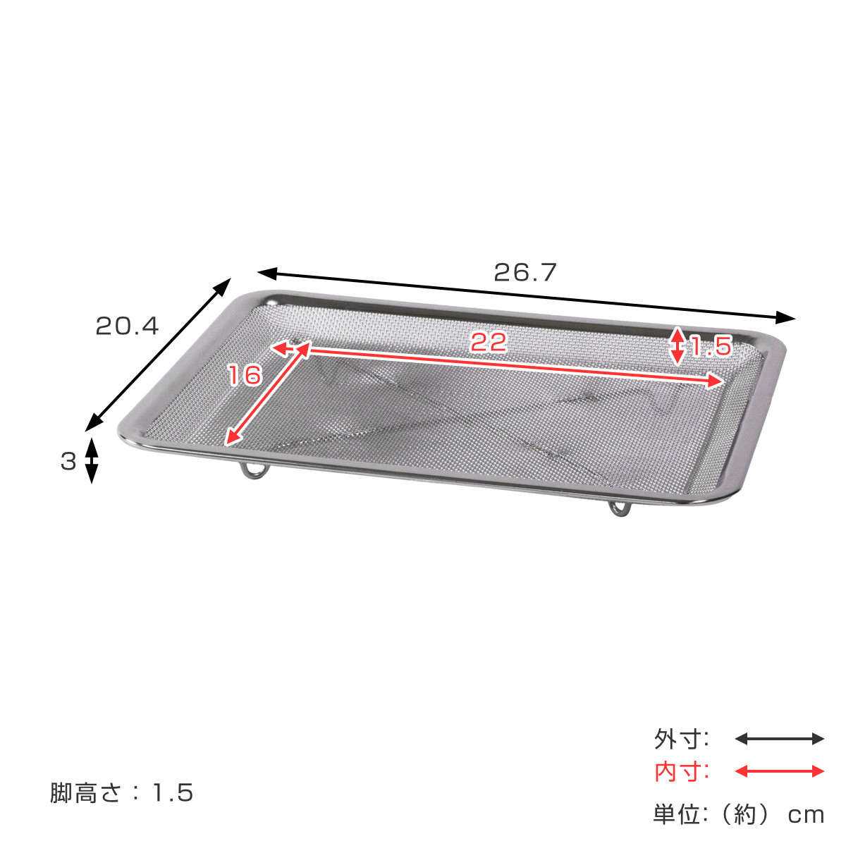 関連キーワード:天ぷら網 フライ網 油切り網 トレイ キッチン用品 キッチン雑貨 キッチンツール 調理小道具 調理用品 調理小物 調理ざる 調理用ざる 脚付き 保存 容器 台所 コランダー 四角 レクタングル 下準備 盛り付け スタッキング シルバー シンプル おすすめ オススメ 便利 役立つ サビにくい 錆びにくい 高級感 幅26.7 奥行20.4 高さ3 26.7 27 20.5 3