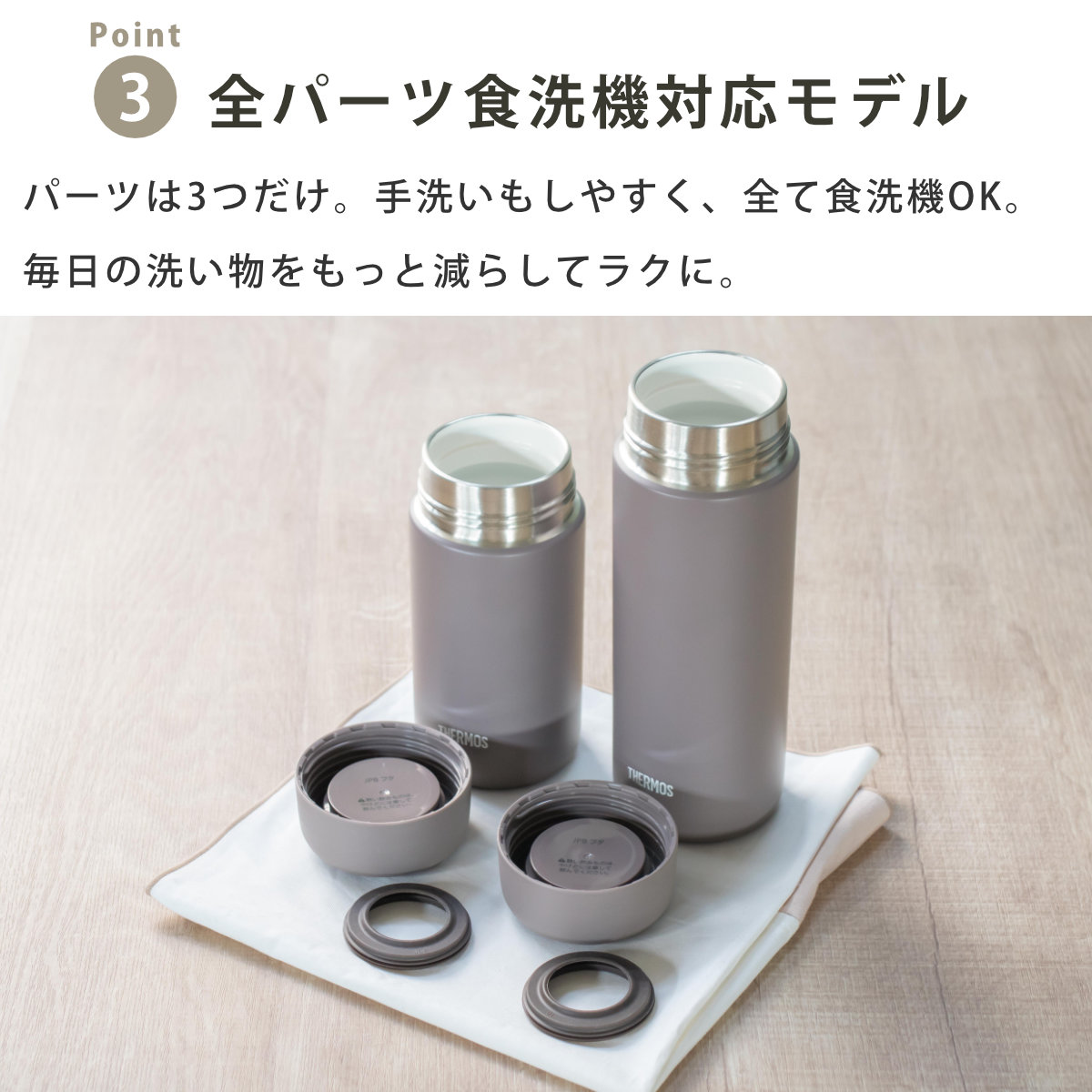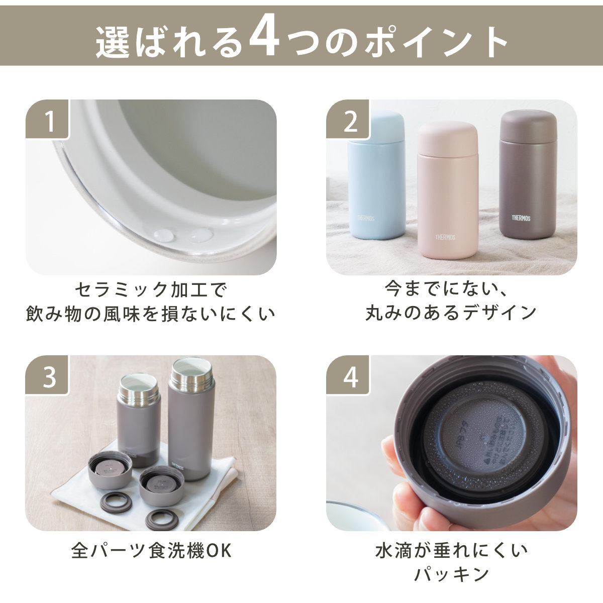 | 材質 | 内びん:ステンレス鋼(セラミック塗膜加工) 胴部:ステンレス鋼(アクリル樹脂塗装) 蓋:ポリプロピレン(発泡ポリプロピレン内蔵) パッキン:シリコーンゴム |