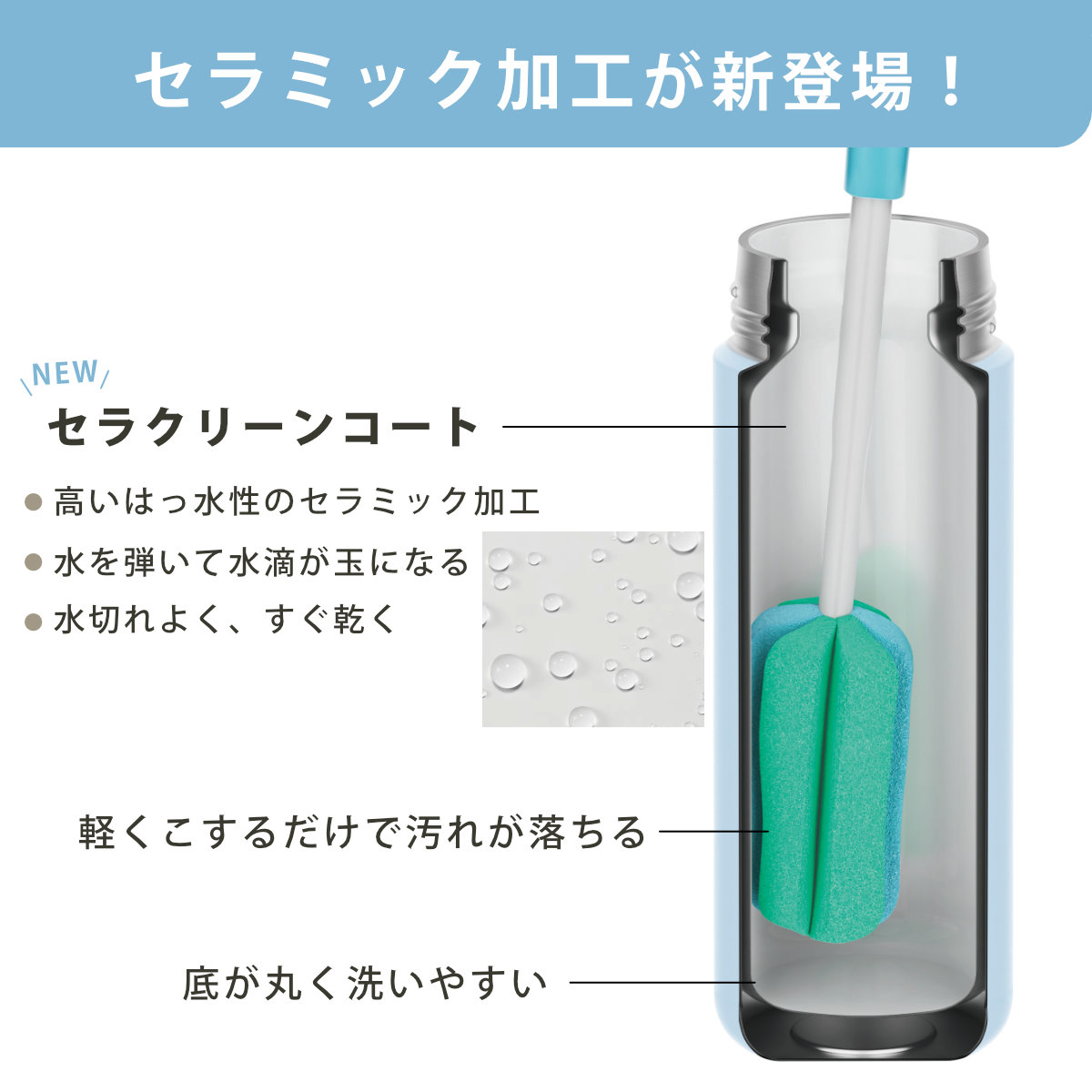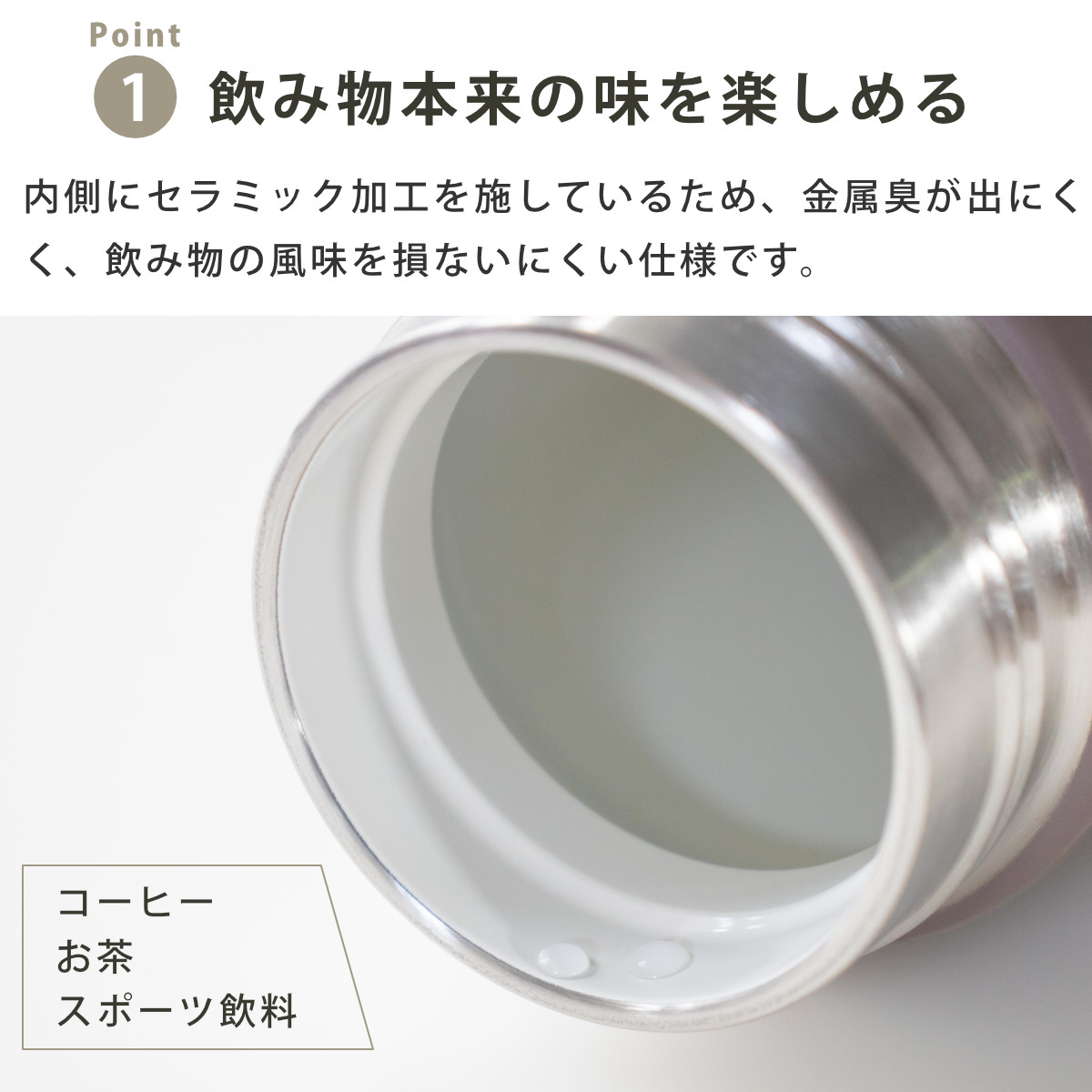 | 材質 | 内びん:ステンレス鋼(セラミック塗膜加工) 胴部:ステンレス鋼(アクリル樹脂塗装) 蓋:ポリプロピレン(発泡ポリプロピレン内蔵) パッキン:シリコーンゴム |