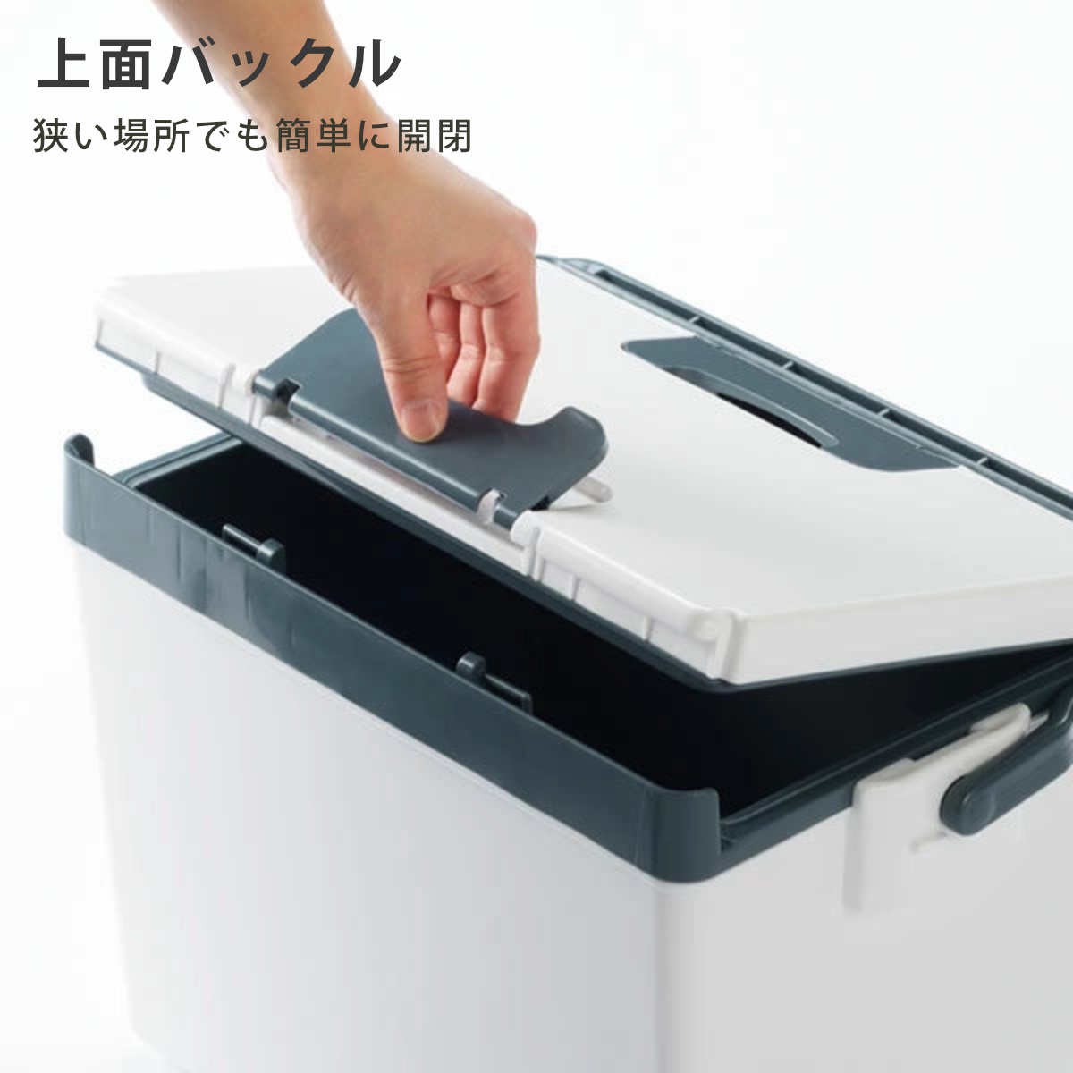 上面バックルなので、スペースが限られた場所でもラクに開け閉めできます。横にスペースがない場所で、上から手を入れて開けられるため、中の物が取り出しやすくなります。