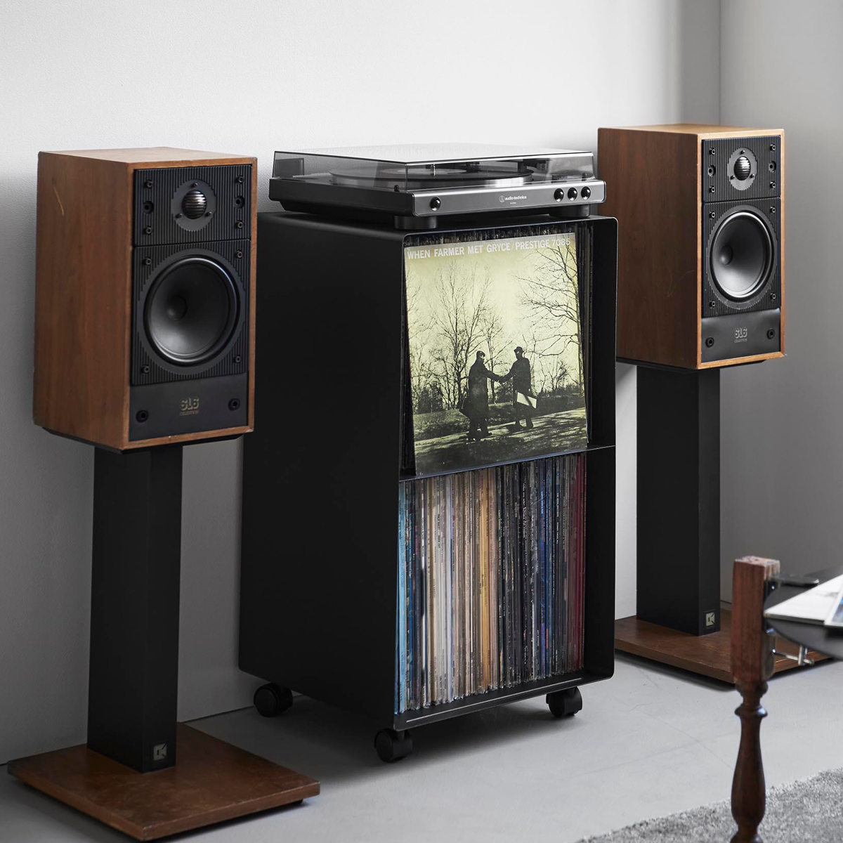 スチール製のキャスター付きレコードラックです。上段、下段ともにお気に入りのレコードジャケットを立ててディスプレイできる溝があり、1段あたり最大70枚まで収納可能です。お気に入りのポスターのディスプレイにも便利です。